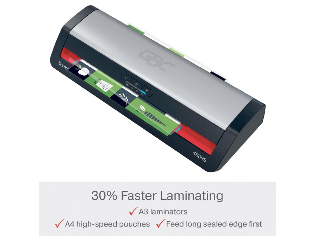 • vysokorýchlostné laminátory GBC skracujú čas laminovania o 30 % pri použití laminovacích vreciek GBC na rýchle laminovanie