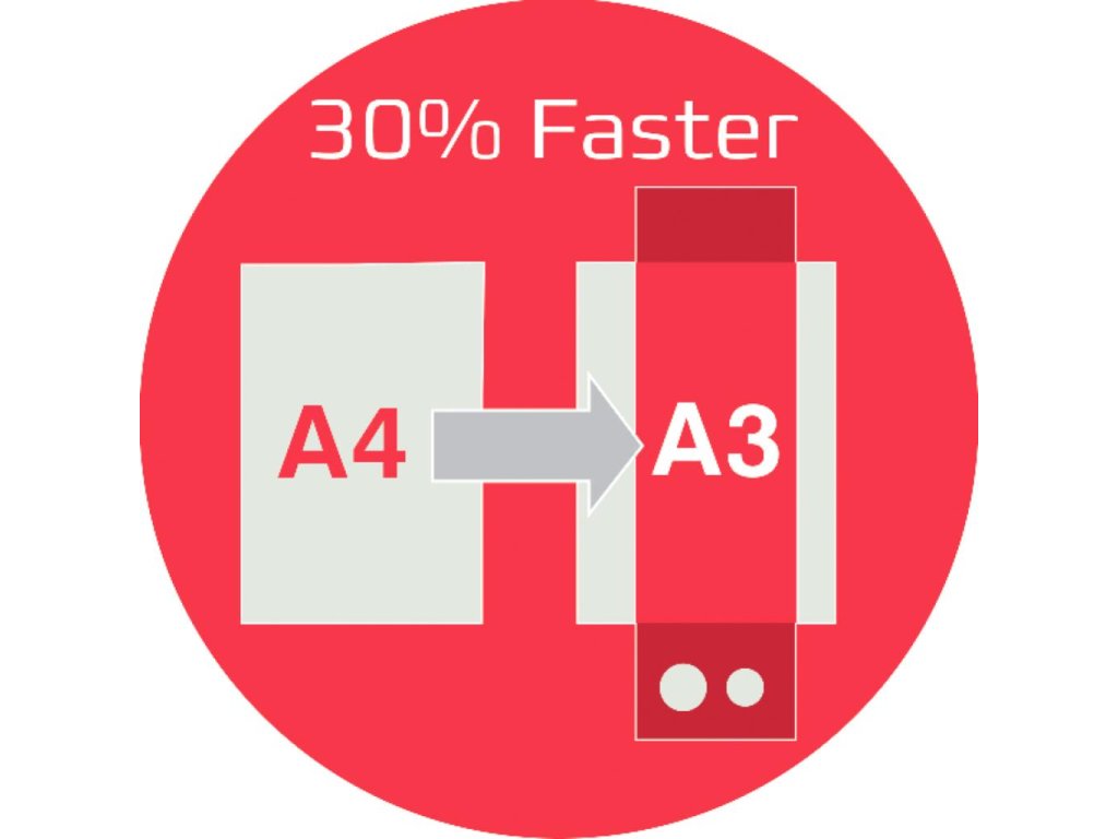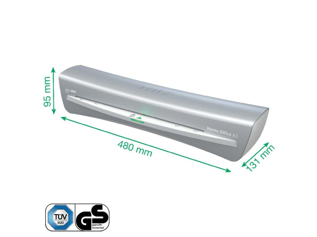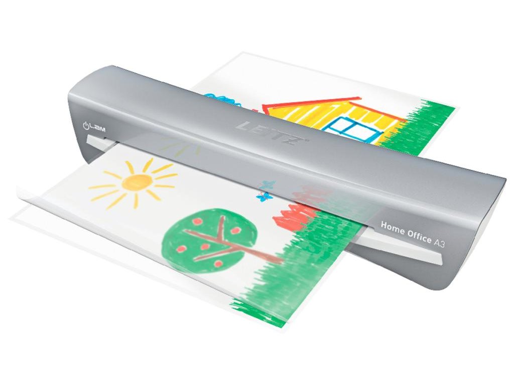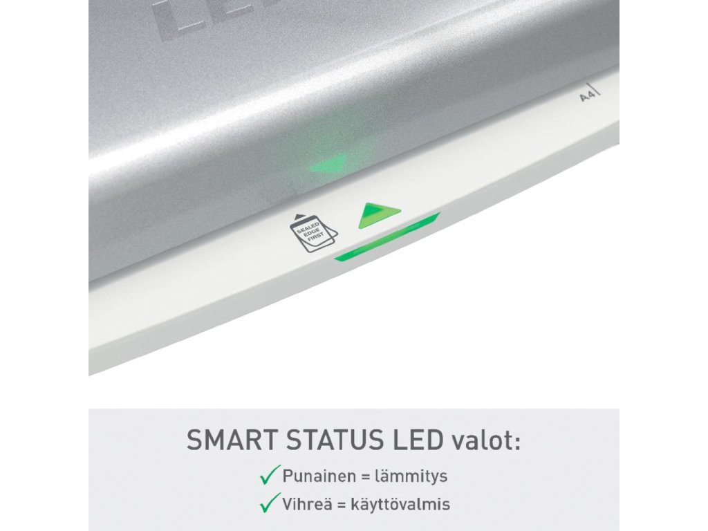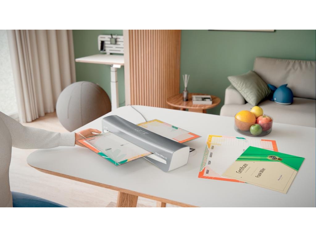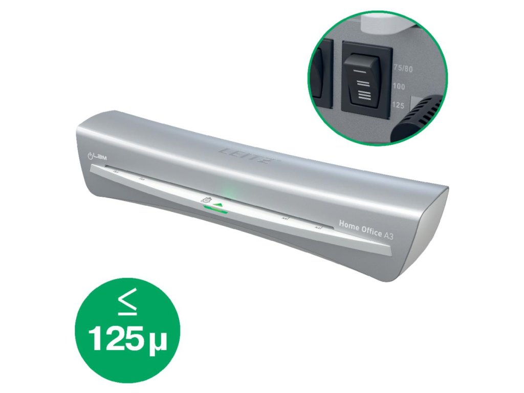 Štýlový a kompaktný laminovací prístroj Leitz iLAM Home Office spája moderný dizajn s funkčnosťou. Tento pre obsluhu prívetivý laminátor vo formáte A3 ponúka rýchle 2-minútové zahriatie a dokument A4 v 80-mikrónovej kapse na laminovanie zalaminuje už za obyčajných 45 sekúnd. Kolískový prepínač umožňuje výber z troch úrovní hrúbky kapsy na všestranné použitie a splnenie všetkých požiadaviek na laminovanie. Hladkú prevádzku zabezpečuje mechanizmus proti zaseknutiu kapsy tak, že bez námahy odstráni akékoľvek zaseknuté alebo zle vložené vrecká na laminovanie. Inovatívna inteligentná stavová LED dióda uľahčuje používanie pomocou intuitívnych svetiel a zvukov: červená dióda znamená zahrievanie, zelená so zvukovým upozornením oznamuje pripravenosť na laminovanie, blikajúca červená dióda znamená automatické vypnutie po 15 minútach nečinnosti. Chráňte svoje dokumenty rýchlo, efektívne a štýlovo. Určené na kapsy od 75 do 125 mikrónov. TUV/GS, CE certifikácia. Strieborná a biela farba.