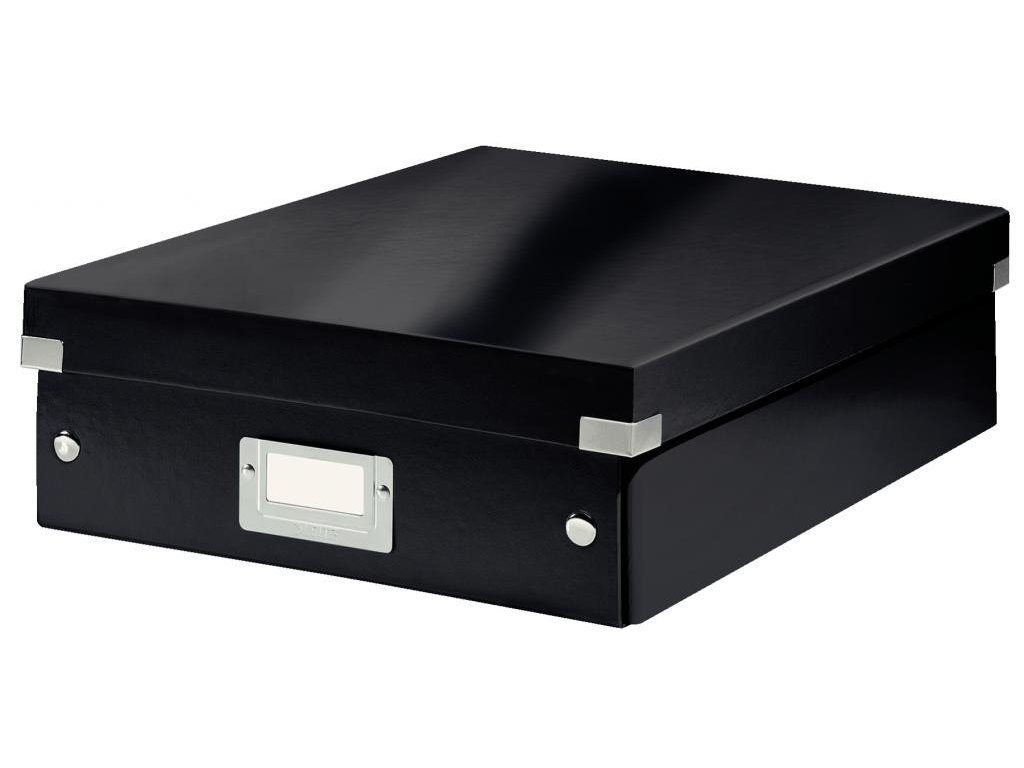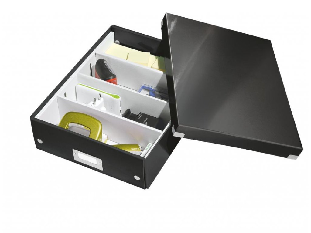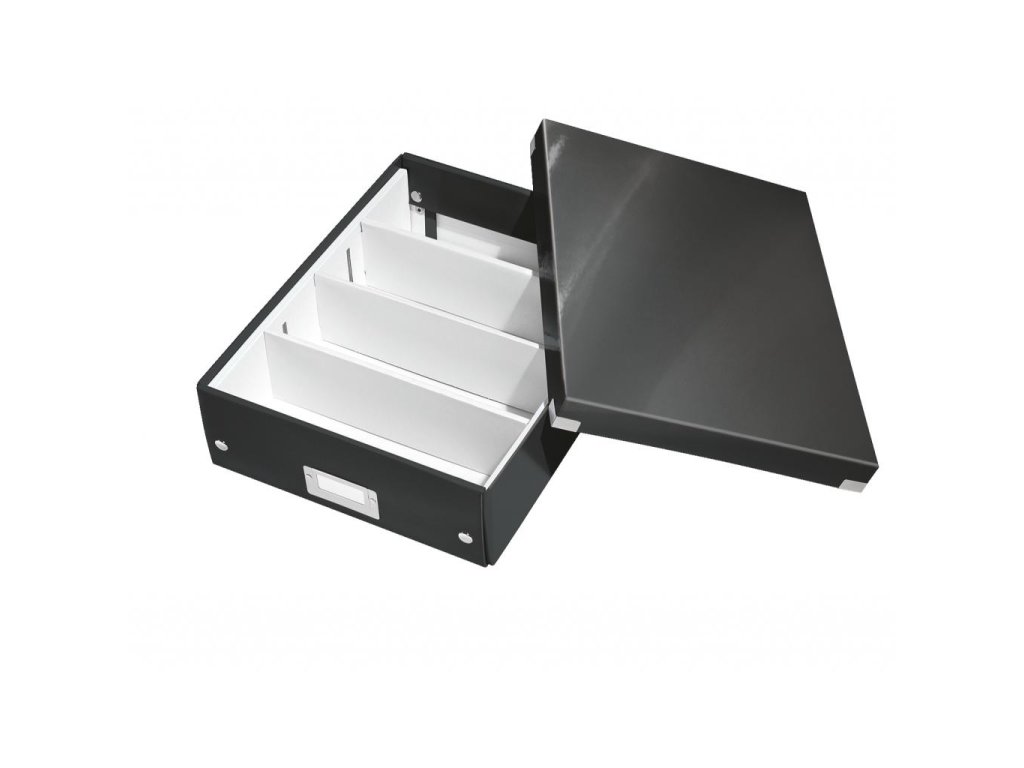 Štýlová skladacia krabica s vekom a s rámčekom na štítok. Na usporiadanie nabíjačiek, káblov a ďalšieho vybavenia kancelárie. Veľkosť M. Na prvý pohľad vidíte, čo sa vojde dovnútra! Výška krabice bola navrhnutá tak, aby vám poskytla dostatok priestoru na uloženie príslušenstva a zároveň zabránila skladaniu vecí na seba. Na vylepšenie usporiadania obsahu krabice použite priložený vnútorný systém priehradiek. Môžete rozdeliť krabicu na 2 alebo 3 časti a zabrániť tak miešaniu káblov alebo fotiek. Pevný kartón potiahnutý polaminovaným papierom. Farba čierna.Inteligentná skladacia konštrukcia: rýchle a jednoduché zloženie bez nutnosti použitia skrutiek a možnosť opätovného rozloženia na úsporu miesta, keď krabicu práve nepotrebujete
