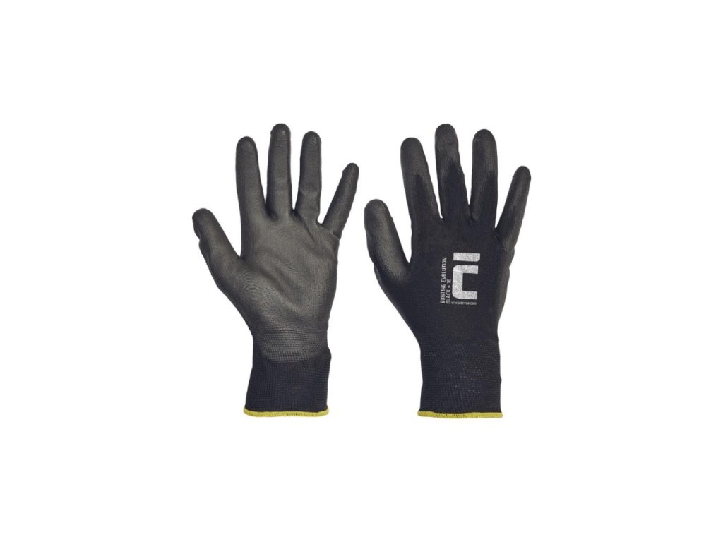 Pletené bezešvé polyesterové rukavice, s tenkou vrstvou polyuretanu v dlani a na prstech a pružnou manžetou.Materiál máčania: polyuretán