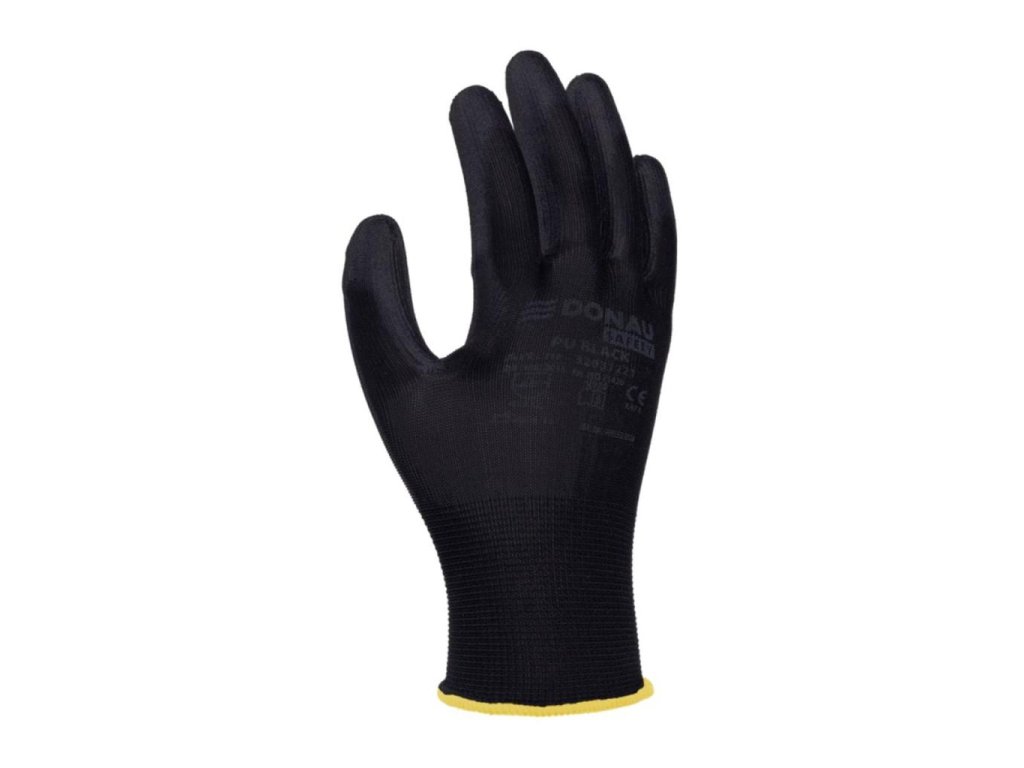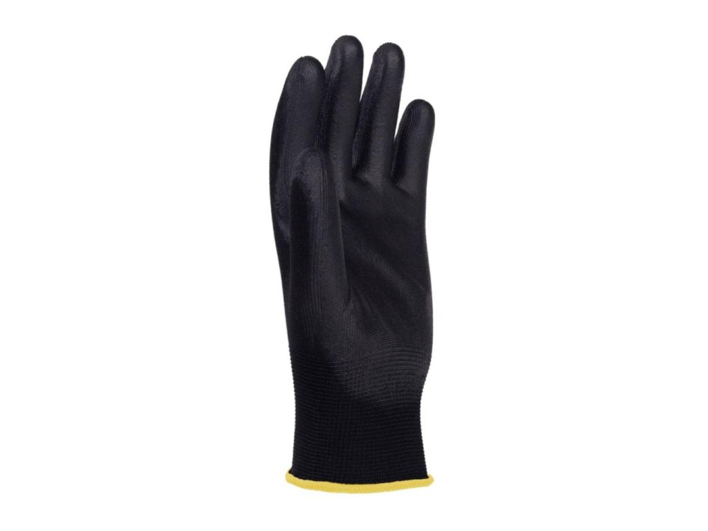 rukavice z kvalitného polyesterového úpletu čiernej farby, v oblasti úchopu potiahnuté čiernym polyuretánomurčený pre montážne, skladové, strojárske, elektrotechnické, servisné, lakovnícke, opravárenské, priemyselné, záhradné a hobby činnosti