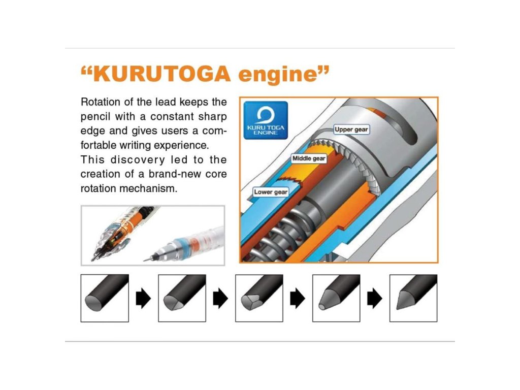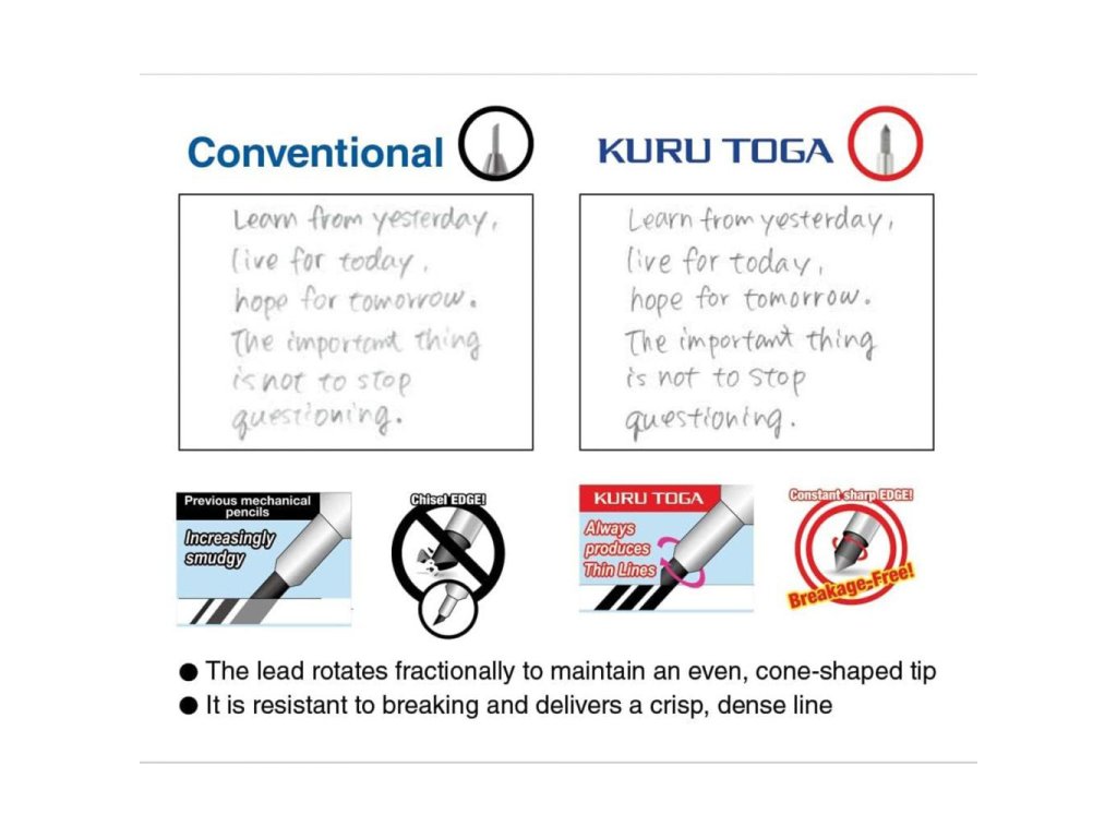Kuru Toga je spojenie dvoch japonských slov, Kuru „otáčať sa“ a Togaru „byť ostrý“. A presne to vystihuje systém mikroceruzky Kuru Toga. Vďaka jedinečnému mechanizmu, ktorý tuhu otočí zakaždým, keď sa zdvihne z papiera. Línia je vždy ostrá a má stále rovnakú silu kdekoľvek s ňou píšete. Tuha 0,5 mm. Farba tela sivá.Dodatočné parametre