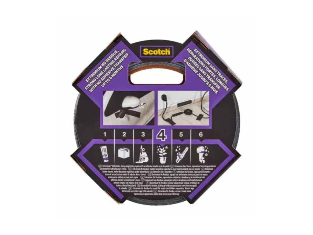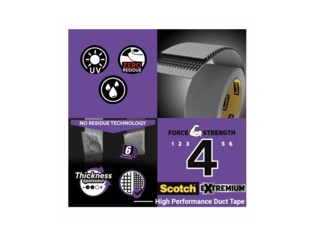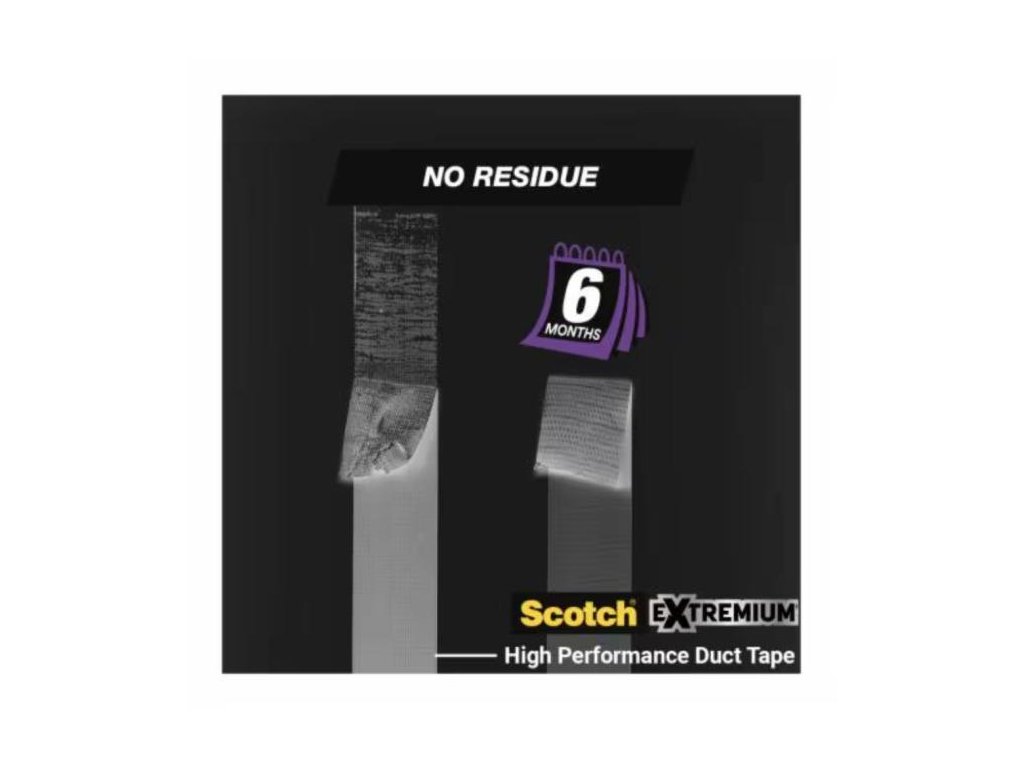Ak chcete pevnú priľnavosť bez čistenia pri odstraňovaní, použite vysokoúčinnú lepiacu pásku Scotch® Extremium™ NO RESIDUE typu duct. Kombinuje pevnú priľnavosť s exkluzívnou technológiou, ktorá umožňuje odstránenie bez zvyškov z väčšiny nepriehľadných povrchov až 6 mesiacov po použití. Vďaka tomu je práca jednoduchšia a rýchlejšia, pretože nie je potrebné žiadne čistenie.Túto pásku možno použiť na dočasné a polotrvalé použitie v interiéri aj exteriéri. Vďaka tomu je ideálna pre široký rad prác, od spájania až po krátkodobé opravy automobilov, upevňovanie káblov na podlahy a zabezpečovanie záhradníckych krytín. Dá sa ľahko odtrhnúť aj rukou, bez použití nožníc.
