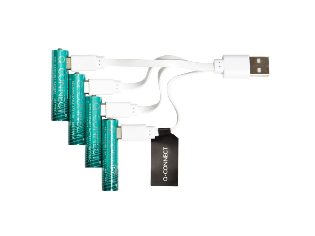 Nabíjteľné AAA batérie Q-Connect, ktoré je možné jednoducho nabiť pomocou pripojenia USB-C, rovnako ako napríklad telefón. Doba doba nabíjania je 2h. Súčasťou balenia sú 4 ks nabíjateľných batérií a 1 ks kábla.Dodatočné parametre