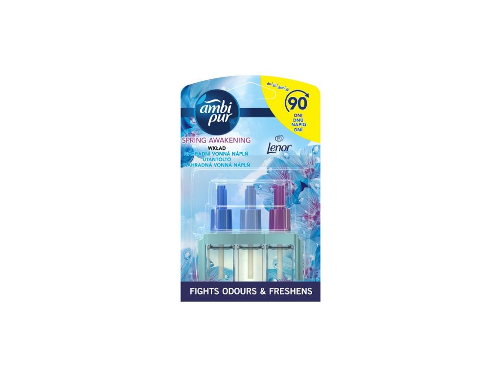 Ambi Pur 3Volution Spring Awakening nepretržite odstraňuje pachy a strieda 3 vzájomne sa doplňujúce vône pre sviežosť, ktorú budete vnímať. Vydrží až 90 dní (pri používaní 12 hodín denne s nastavením najnižšej úrovne odparovania). Objavte krásu Spring Awakening s intenzívnejšou vôňou s väčším dosahom, ktorá naplní miestnosť vôní. Spring Awakening je ľahká vôňa zelene inšpirovaná jarnou prirodzenou sviežosťou Lenoru. Vnímajte pokoj, ktorý vás obklopí, keď sa vzduch naplní touto čistou a decentnou vôňou. U bežných elektrických osviežovačov si na vône rýchlo zvykneme a prestaneme ich vnímať. Ambi Pur Osviežovač vzduchu 3Volution sviežosť obnovuje tým, že sa každých 45 minút automaticky striedajú 3 ° vzájomne sa doplňujúce, vysoko kvalitné vône. Náplne Ambi Pur 3Volution používajte s odparovacím strojčekom 3 Volution, aby ste naplnili váš domov sviežosťou a vôňou, ktorú budete vnímať deň čo deň, týždeň čo týždeň. 3Volution taktiež umožňuje nastaviť intenzitu odparovania vône.Dodatočné parametre