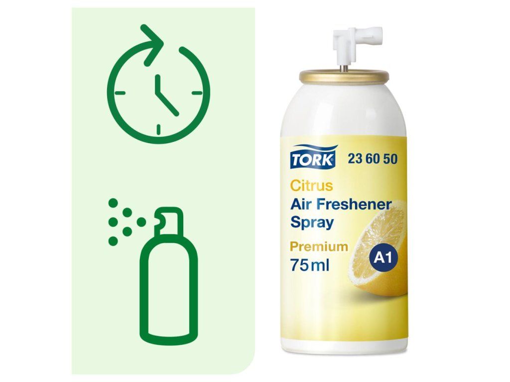 Náplň do elektronického osviežovača vzduchu TORK. Vôňu vo vašej toalete a umyvárni môžete dôkladne a efektívne kontrolovať. Sprej obsahuje vonné oleje a patentovanú zložku neutralizujúcu nepríjemné zápachy a zároveň poskytuje dlhotrvajúci pocit čerstvého vzduchu. Správna vôňa vyvinutá popredným európskym parfumérom.Objem 75 mℓ. Vôňa citrusová.
