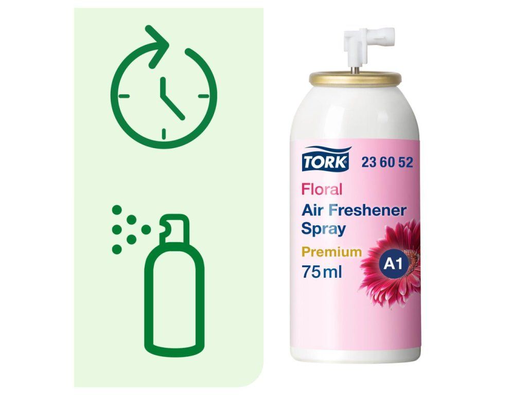 Náplň do elektronického osviežovača vzduchu TORK. Vôňu vo vašej toalete a umyvárni môžete dôkladne a efektívne kontrolovať. Sprej obsahuje vonné oleje a patentovanú zložku neutralizujúcu nepríjemné zápachy a zároveň poskytuje dlhotrvajúci pocit čerstvého vzduchu. Správna vôňa vyvinutá popredným európskym parfumérom. Objem 75 mℓ. Vôňa kvetinová.Dodatočné parametre