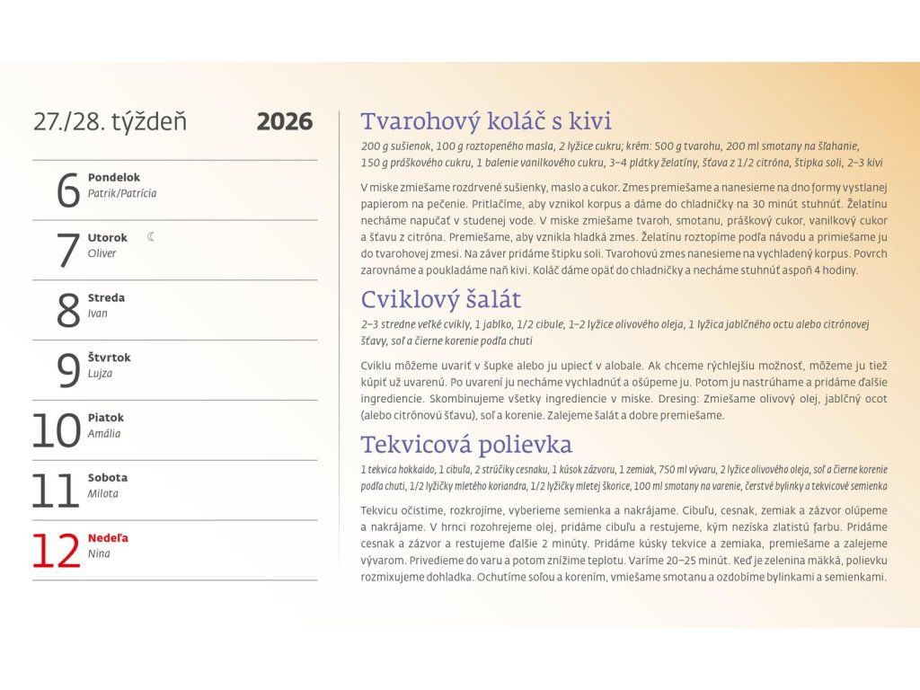 Formát kalendára: 22,6 x 13,9 cmKalendárium: slovenské týždenné riadkové