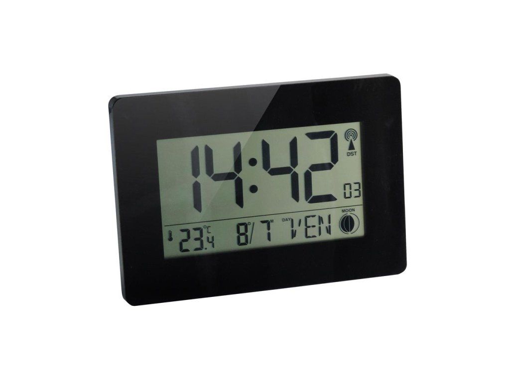Hodiny v čiernej lakovanej úprave s výbornou čitateľnosťou. Riadené rádiovým signálom DCF s automatickým nastavením času a dátumu podľa najpresnejších hodín sveta a automatickou zmenou letného a zimného času. Digitálne zobrazenie času vo formáte 12 / 24 hodín, dátum (deň, mesiac), meranie vnútornej teploty, zobrazovanie je na výber zo 7 jazykov (anglický, nemecký, francúzsky, taliansky, dánsky, španielsky, holandský). Rozmery 229 × 162 mm, hrúbka 27 mm. Možnosť postaviť na stôl alebo zavesiť na stenu. Súčasťou balenia sú 2 batérie AA. Farba čierna.Dodatočné parametre