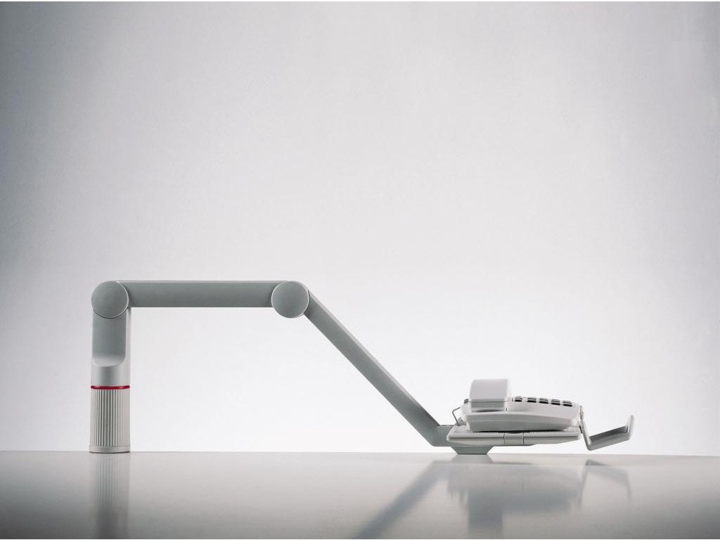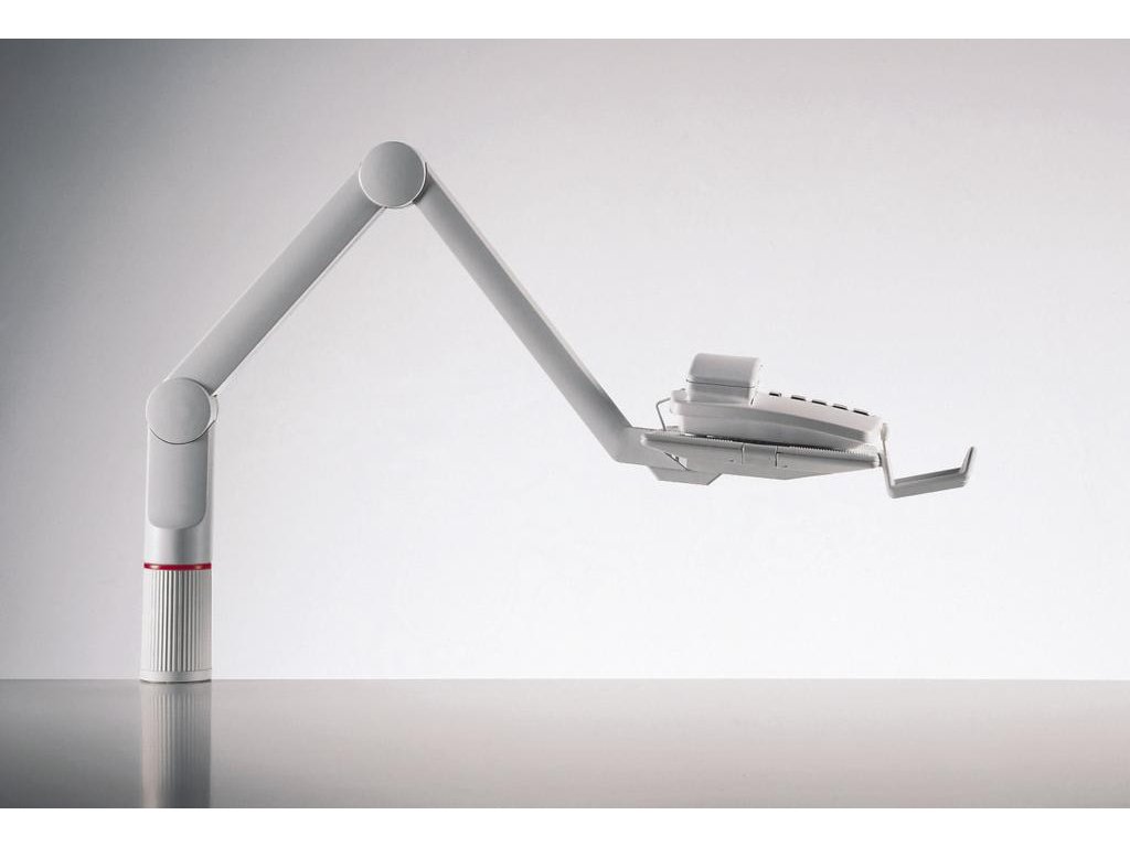 Kĺbový nosič telefónu. Otáčanie o 360 stupňov, 3 fixované pozície, nosnosť 2 kg. Sklon základne (10, 5 a 0 stupňov) upravuje výber pozície a umožňuje pohodlnú manipuláciu s nosičom. Výška nad pracovným stolom 14 cm. Základňa inštalovaná na šírku alebo na výšku, t. j. 26 × 17 cm alebo 17 × 26 cm. Dodávaný v štandarnej verzii s úchytom na hrúbku stola 1,8 až 7,4 cm. Farba sivá.Farba: svetlosivá