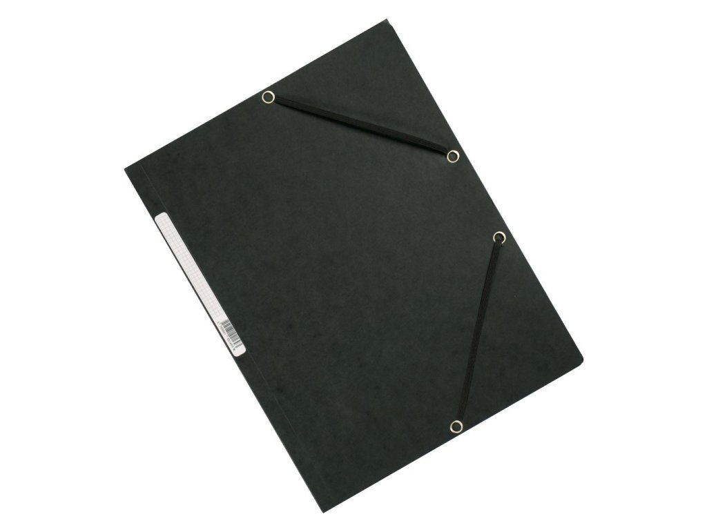Obal s tromi chlopňami a gumičkou z kvalitného hladkého kartónu gramáže 375 g. Chrbtový štítok, kapacita 200 listov. Farba čierna.Certifikát FSC.