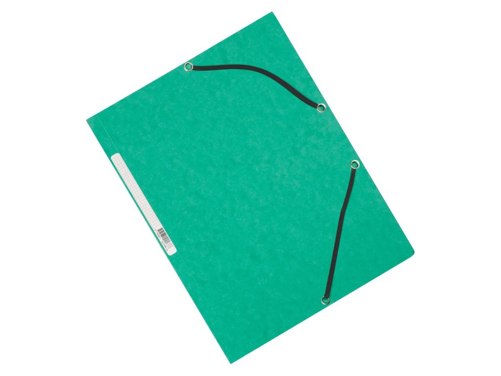 Obal s tromi chlopňami a gumičkou z kvalitného hladkého kartónu gramáže 375 g. Chrbtový štítok, kapacita 200 listov. Farba zelená.Certifikát FSC.