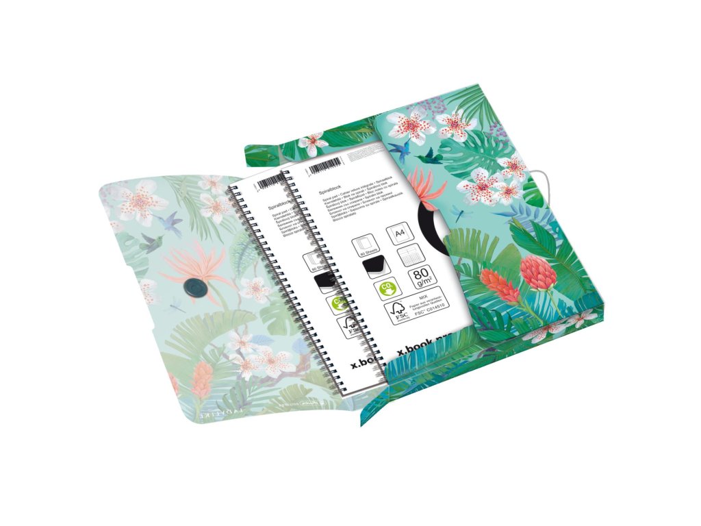 Box na spisy A4, uzatváranie s gumičkou na plastový krúžok, polypropylén. Kapacita 400 listov, výška plnenia 4 cm. Motív Jungle.Dodatočné parametre