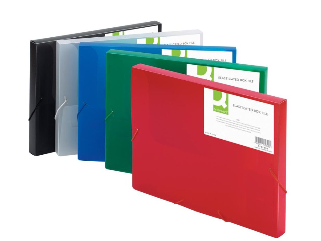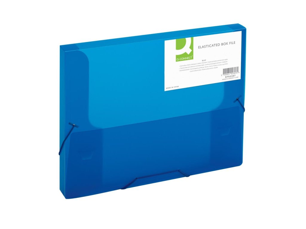 Transparentný plastový box s tromi chlopňami vyrobený z polypropylénu, uzatvárateľný gumičkou. Kapacita 250 listov, šírka chrbta 25 mm. Farba modrá.Dodatočné parametre