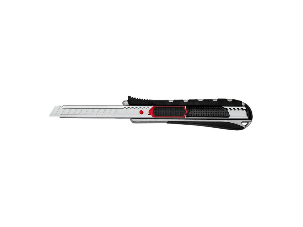 Kovové rezače s gumenou zónou, integrovaným odlamovačom čepele s funkciami štandardného a bezpečnostného rezača. Po ukončení rezu alebo v prípade, keď sa ostrie kĺže po rezanom materiáli, sa čepeľ automaticky zasunie. Čepeľ možno vysúvať aj pomocou integrovaného bežca. Šírka čepele 9 mm. Schválené inštitútom TÜV. Farba červená/ čierna.Dodatočné parametre