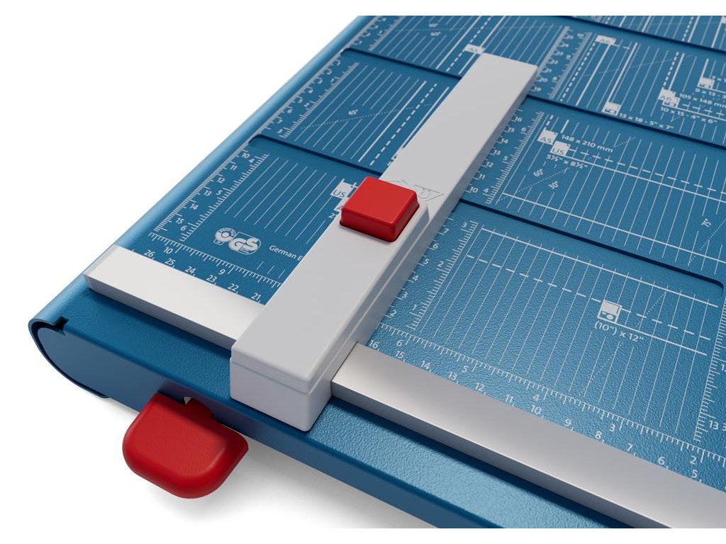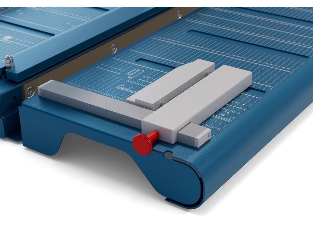 Protišmiková, robustná a presná páková rezačka s kovovou základňou a automatickým prítlakom. Brúsený vrchný a spodný nôž z kvalitnej nožiarskej ocele Solingen, rotujúci kryt okolo ostria. Presná mierka v cm/ inch a DIN formátoch. Výrez na spodnej časti na pohodlné prenášanie. Veľkosť stola 460 × 490 mm. Komfortná výbava s podporným predným stolom a zariadením na rezanie tenkých prúžkov a laserovým lúčom, indikujúcim reznú líniu.Pohodlná práca vďaka ergonomickej rukoväti optimalizovanej pre prenos sily zhora. Automatické, odnímateľné upnutie pre väčšie pohodlie pri rezaní materiálov citlivých na tlak.