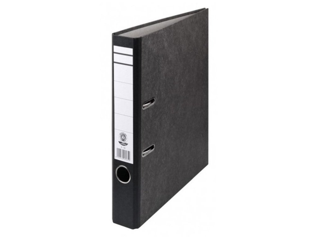 Zakladač so štruktúrovaným papierovým poťahom mramorového vzoru, formát A4. Vybavený kovovým prítlakom, chrbtovým krúžkom a nalepeným chrbtovým štítkom. Šírka chrbta 5 cm. Väčšie balenie: 25 ks. Farba čierna.Chrbát: 5 cm
