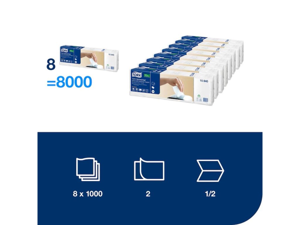 Tork Xpressnap® Premium servítky do zásobníka sú výborné pre samoobslužné reštaurácie. Pomáhajú znížiť spotrebu servítok minimálne o 25 % v porovnaní s tradičnými zásobníkmi na servítky. Tork Xpressnap® extra jemné biele dvojvrstvové servítky do zásobníka sú ideálne pre zariadenia, ktoré sa starajú o pohodlie, náklady a kvalitu.Dĺžka rozloženého útržku: 21,30 cm