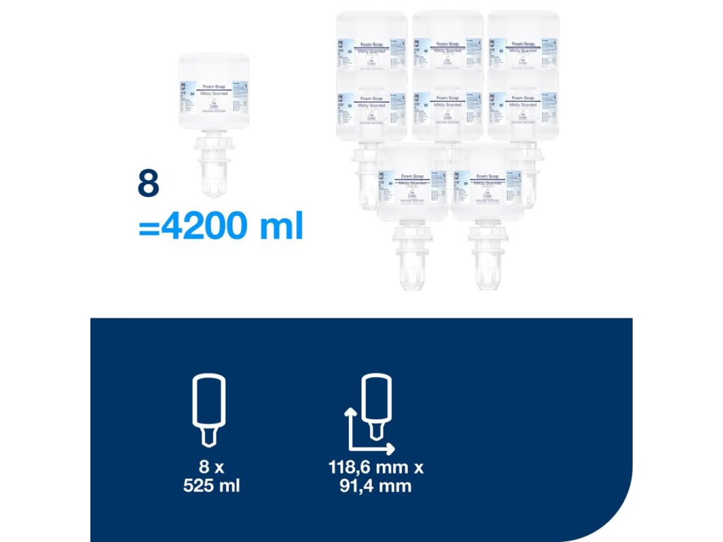 Poskytnite normálnej a suchej pokožke starostlivosť na každodenné umývanie rúk. Tork jemné penové mydlo má príjemnú vôňu vrátane vyživujúcich a obnovujúcich prísad a tvorí jemnú krémovú penu na šetrné umytie rúk. Vhodné pre Tork mini zásobníky na mydlá a dezinfekčné prostriedky, ktoré sú certifikované ako ľahko používateľné a všetkým používateľom poskytujú správnu hygienu rúk.Dodatočné parametre