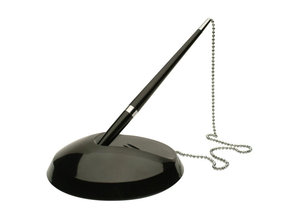 Plastové pero na stojane s prilepovacou základňou, spojené 58 cm retiazkou. Dodávané s čiernou náplňou a 2 náhradnými náplňami. Farba čierna. Rozmer tuhy 10,7cmDodatočné parametre