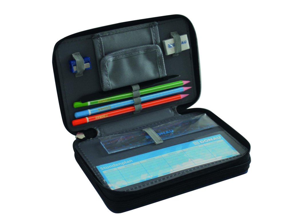 Peračník 2-zipsový s výbavou, v 6 rôznych dizajnoch. S praktickým vnútorným vreckom na drobnosti, vyrobený z odolného polyesterového materiálu. Výbava (23 dielov): 1 guma, 1 strúhadlo, 3 ceruzky, 1 pravítko, 1 rozvrh hodín, 8 fixiek, 8 farebných ceruziek. Rozmery: Š x V x H: 200 x 40 x 130 mm.Materiál: polyester