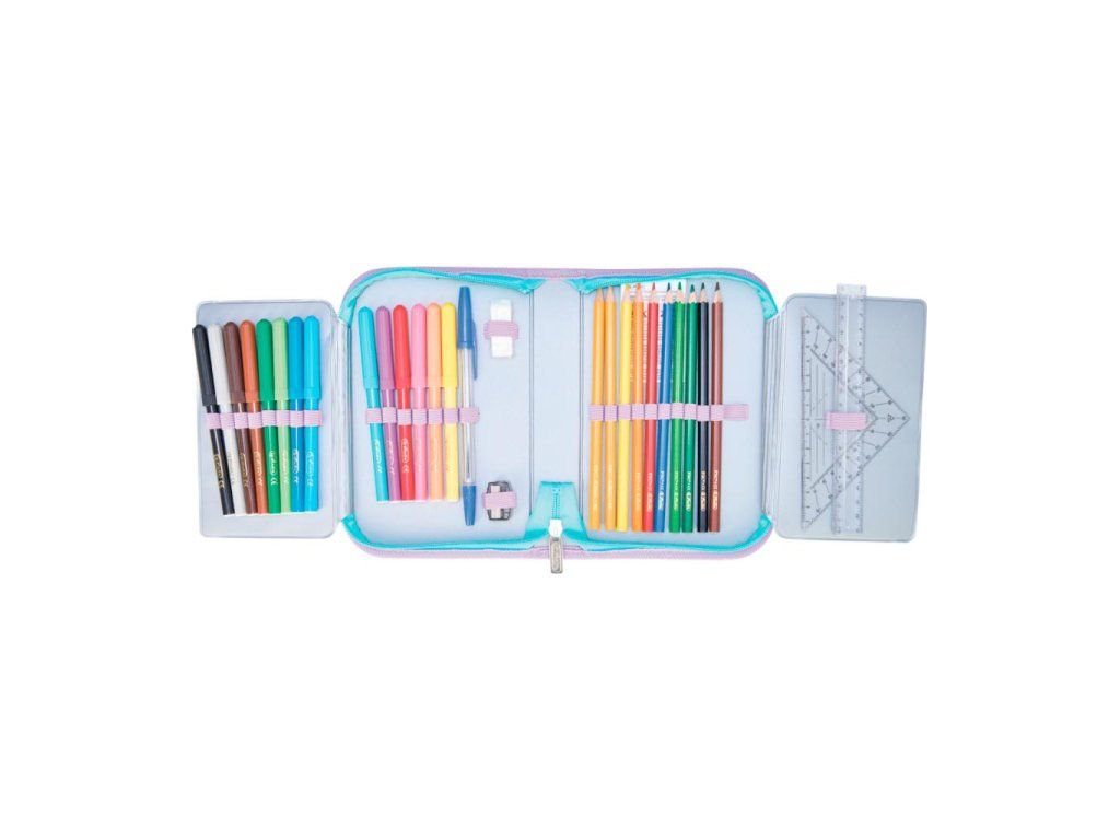 Peračník 2-klopý s výbavou, vnútorná podšívka: farebná. Výbava: 14 fixiek, 8 šesťhranných pasteliek, 2 ceruzky šesťhranné, 1 plastové strúhadlo, 1 guma, 1 plastové pravítko 16 cm, 1 trojuholníkové pravítko, 1 guľôčkové pero, 1 rozvrh hodín, 1 vizitka. Dizajn: Morský koník.Dodatočné parametre