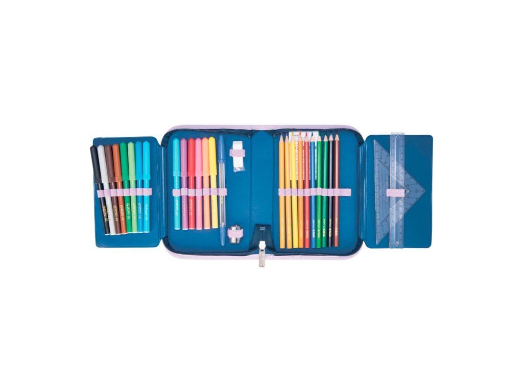 Peračník 2-klopý s výbavou, vnútorná podšívka: farebná. Výbava: 14 fixiek, 8 šesťhranných pasteliek, 2 ceruzky šesťhranné, 1 plastové strúhadlo, 1 guma, 1 plastové pravítko 16 cm, 1 trojuholníkové pravítko, 1 guľôčkové pero, 1 rozvrh hodín, 1 vizitka. Dizajn: Unicorn.Dodatočné parametre