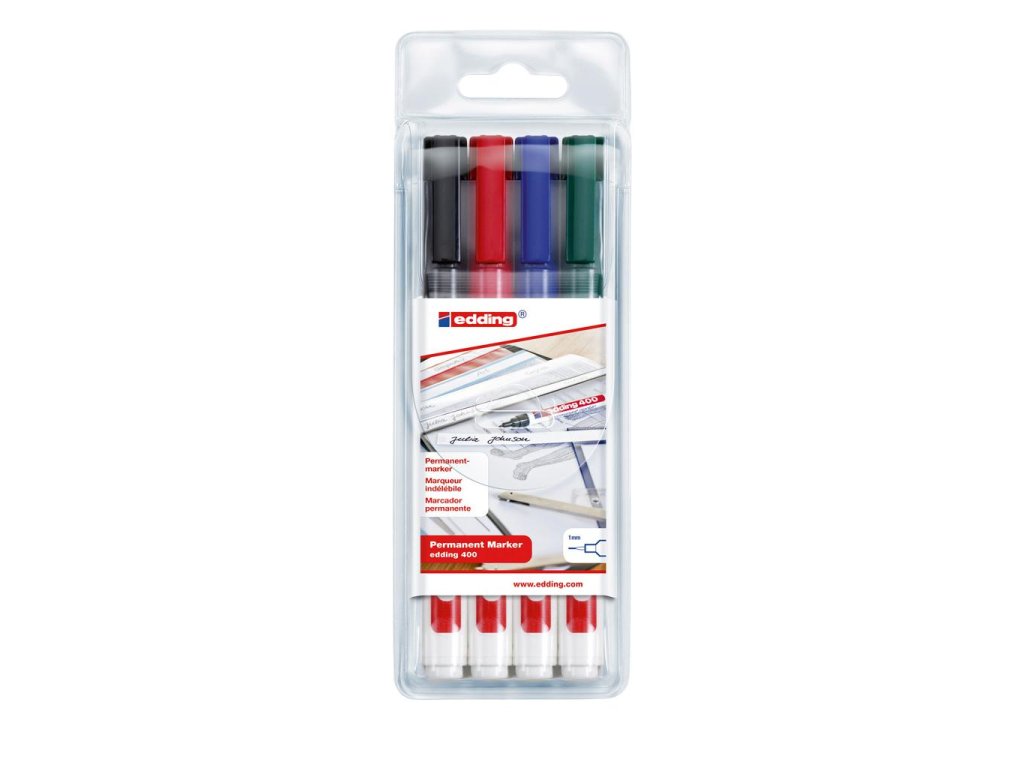 Permanentný popisovač vhodný na popisovanie, značenie a vyznačovanie takmer na všetky materiály vrátane kovu, skla a umelých hmôt. Plastový obal. Dopĺňateľný atramentom edding T 25. Okrúhly hrot, šírka stopy 1 mm. Dodávané v sade 4 ks.Farba: sada 4 ks