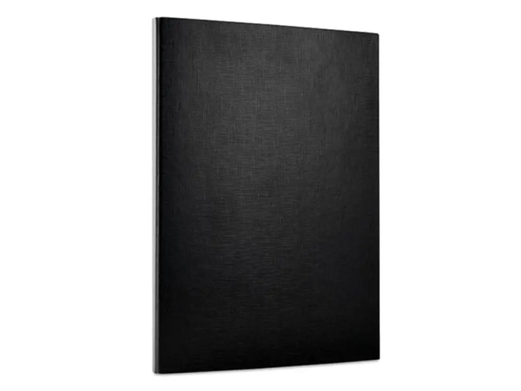 Trojchlopňový box na dokumenty z tvrdeného kartónu. Vonkajšia strana potiahnutá PP fóliou hrúbky 100 um, vnútro biela dyha gramáže 100 g. Uzatvárateľný krúžkami na suchý zip. Kartón hrúbky 1,8 mm. Kapacita 120 listov. Rozmery (š×v×h) 235×315×15 mm.Väčšie balenie 10 ks.Farba: čierna
