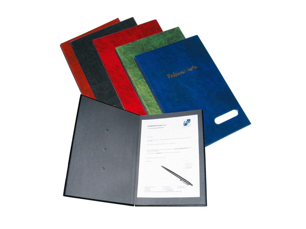 Podpisová kniha 14-dielna s okienkom na prednej strane na jednoduchú výmenu popisovateľného štitka, rozťahovateľný chrbát pre zvýšenie kapacity. Úprava v imitácii kože.Farba: modrá