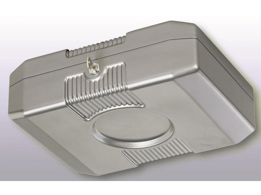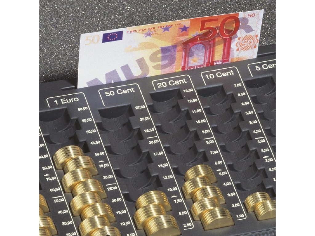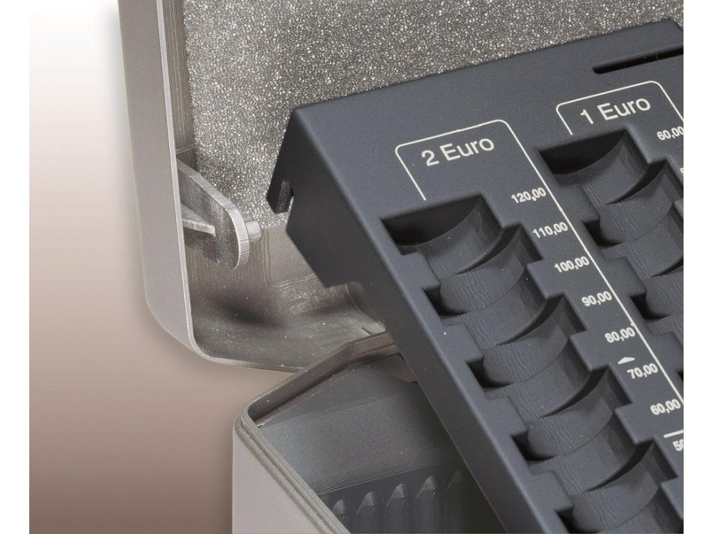 Pokladnička z povrchovo upravenej ocele vybavená mincovou priehradkou s ôsmimi oddielmi na eurá a centy v maximálnej hodnote 233,90 Euro. Štyri prístupné priehradky na bankovky, priestor na poukážky a stravné lístky v spodnej časti. Vnútorné časti vyrobené z nárazu vzdorného materiálu.Sklápateľné ergonomicky tvarované madlo prispieva k dobrému držaniu, pena na vnútornej strane veka zabraňuje premiešaniu mincí pri prenose, dvojzápadkový zámok zvyšuje bezpečnosť. Pokladničky sú vzájomne stohovateľné.Rozmery: 352×120×276 mm