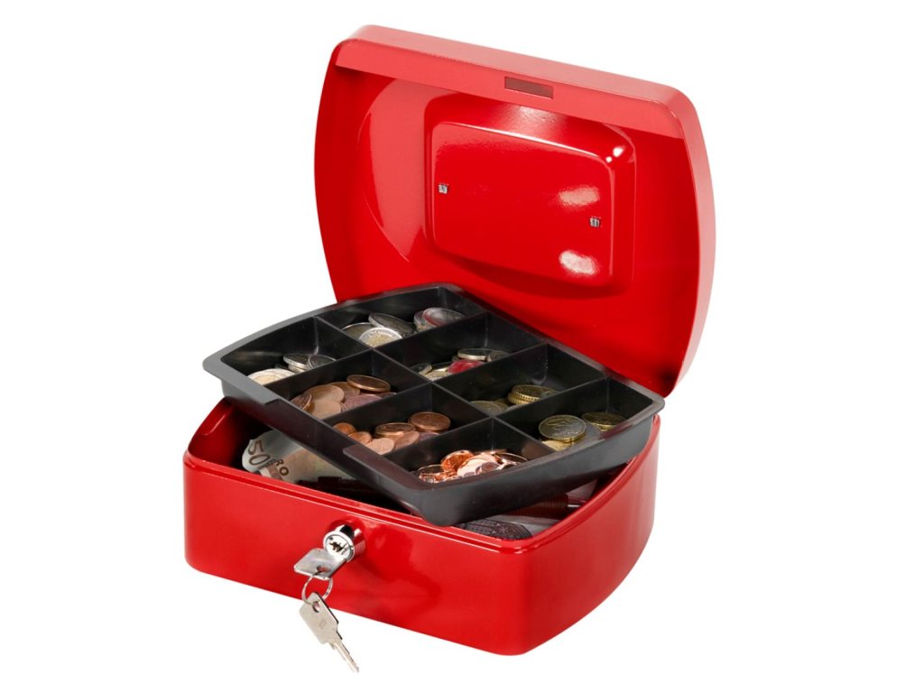 Uzamykateľná pokladnička s tvarovaným úchytom, plastovou priehradkou na mince a 2 kľúčami. Materiál pevná oceľ. Rozmery 205 × 85 × 160 mm. Farba červená.Dodatočné parametre