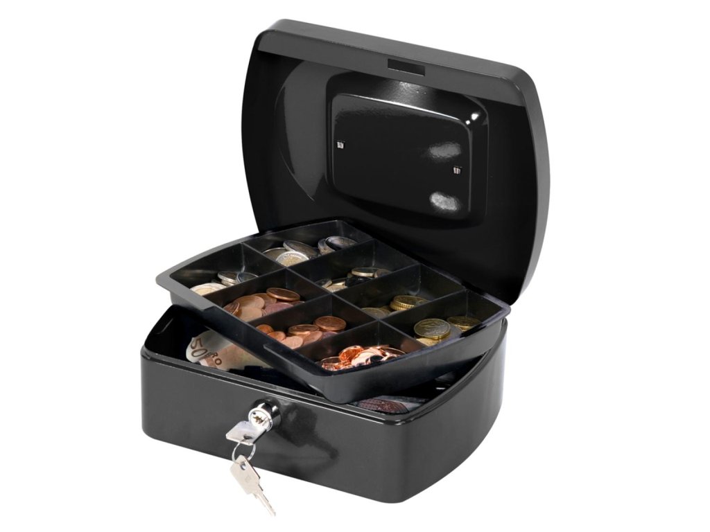 Uzamykateľná pokladnička s tvarovaným úchytom, plastovou priehradkou na mince a 2 kľúčami. Materiál pevná oceľ. Rozmery 205 × 85 × 160 mm. Farba čierna.Dodatočné parametre