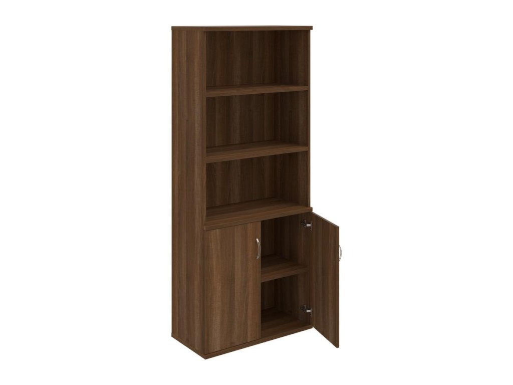 Kombinovaná skriňa - dvere/nika. Kancelárske skrine STRONG majú robustnú konštrukciu a vyššiu nosnosť políc ako bežné kancelárske skrine.V ponuke sú skriňové moduly s výškou 185 cm, 111 cm alebo 74 cm a šírky 80 cm alebo 40 cm.Hĺbka všetkých modelov skriňového radu STRONG je 40 cm.Chrbát, vyrobený z 8 mm hrubých dosák, je obojstranne pohľadový, takže skrine môžete použiť ako priestorový deliaci prvok. Hrúbka samotných políc je 25 mm, čo znamená nosnosť 80 kg na 1 policu.Korpusy, dvierka a police skríň sú olepené odolnou 2mm ABS hranou, ktorá garantuje dostatočnú ochranu proti poškodeniu.