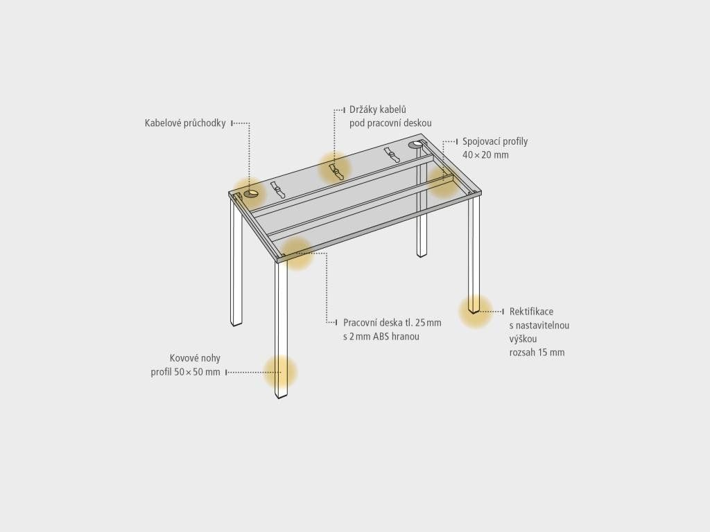 Zdvojený pracovný stôl rovný. Doska stola z kvalitného lamina. Pevná kovová konštrukcia podnožia zo štvorcových profilov 50 x 50 mm je tvorená kompaktnými pármi nôh, ktoré sú spojené priečnikmi. Výškovo nastaviteľná rektifikácia zaisťuje možnosť dorovnania prípadnej nerovnosti podlahy až o 1,5 cm. Stolová pracovná doska z LTD má hrúbku 25 mm a je zakončená 2mm hranou ABS, ktorá ju chráni pred poškodením. Samozrejmosťou sú káblové priechodky a systém pre zavesenie káblov pod stolovou doskou. Možnosť objednania bieleho či sivého prevedenia podnožia. Stolové doplnky, kontajnery a skrine vyberajte z ponuky kancelárskeho nábytku Hobis. Aby sa zásielka dostala v poriadku až do Vašej kancelárie, dodávame stoly demontované v niekoľkých samostatných a bezpečne zabalených škatuliach. Súčasťou každého balenia je tiež prehľadný návod. Na stoly UNI sa vzťahuje záruka 5 rokov. Farebnosť je ilustratívna.