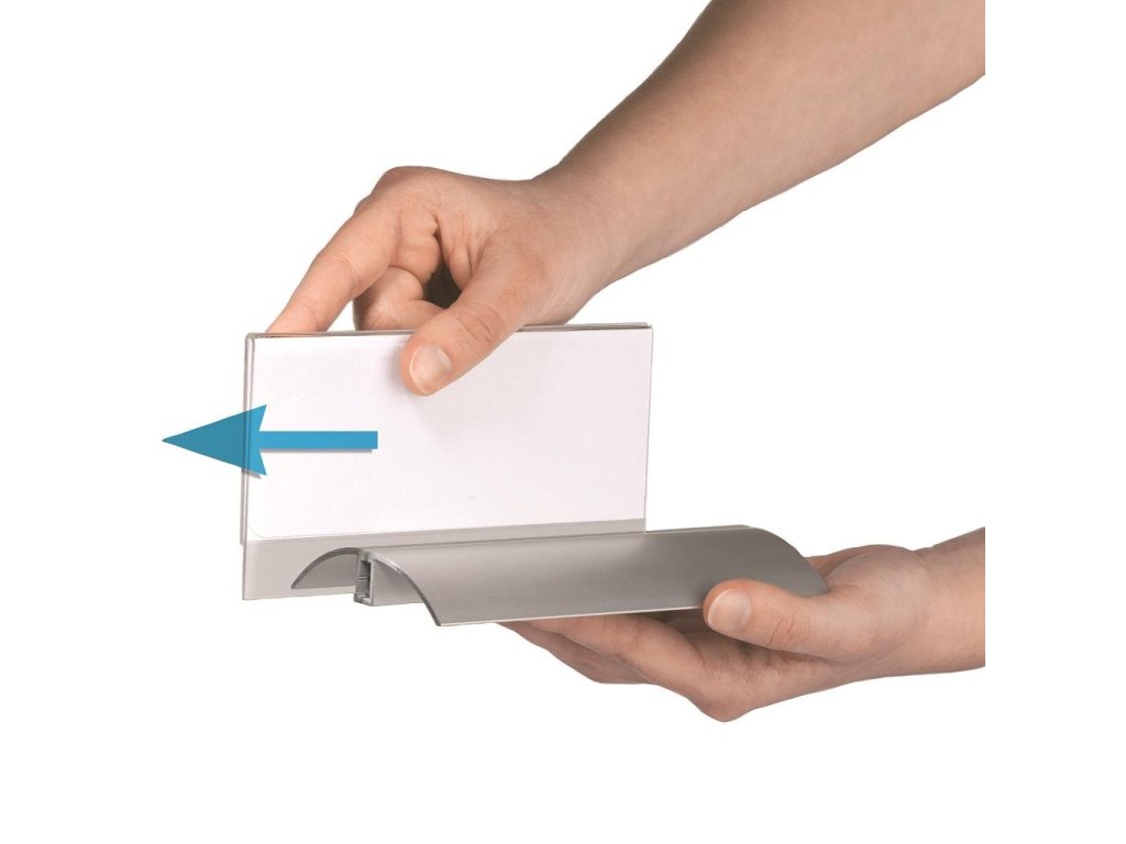 Štýlová stolová menovka s hliníkovým podstavcom. Unikátny uchytávací systém zabraňuje samovoľnému alebo neželanému vysunutiu menovky.Čítanie z oboch strán. Ideálna na konferencie, porady alebo miesta na styk so zákazníkom. Balenie 2 ks.Rozmery: 52 x 100 mm