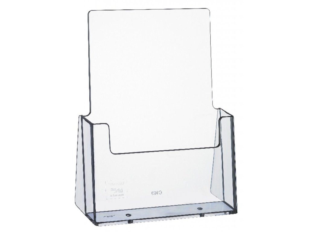 Stojan na prospekty formátu A5 s jedným oddielom. Materiál priehľadný číry plast. Rozmery: (š x v x h) 165 x 180 x 78 mm.Dodatočné parametre