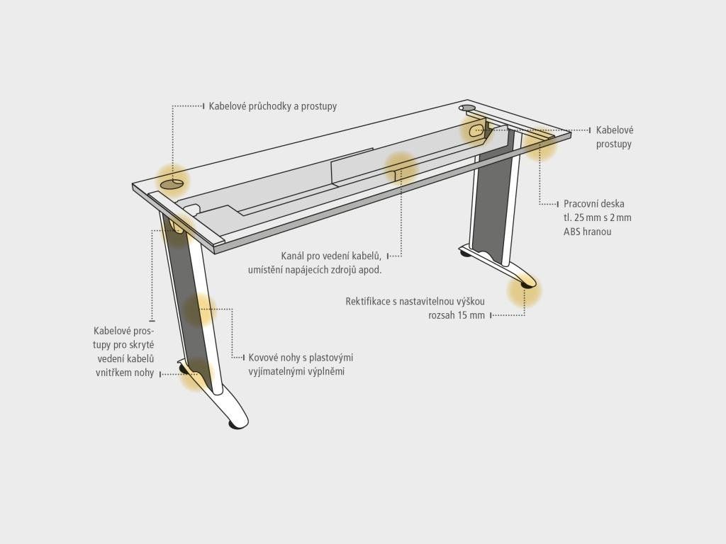 Kancelárský nábytok Flex sa vyznačuje elegantným dizajnom a originalitou technického riešenia. Pracovné dosky s optimálnými rozmermi a tvarom využívajú ergonomicky a efektívne celú pracovnú plochu. Pracovná doska stola má hrúbku 25 mm a je olepená 2mm ABS hranou, ktorá stoly pomáha chrániť pred poškodením. O káble od PC alebo stolovej lampy, sa postará praktická priechodka, ktorá káble jednoducho zvedie pod dosku, kde si s nimi poradia šikovne skonštruované držiaky. Moderné kovové nohy vás oslovia súčasným dizajnom a funkčnosťou. Prepojené sú teleskopickým káblovým kanálom, vďaka ktorému je stôl dokonale stabilný aj bez pracovnej dosky. Okrem toho slúži kanál aj ako elegantný úkryt pre vedenie všetkej kabeláže vášho PC, ktorá je potom pod plastovým krytom kovovej nohy zvedená k podlahe. Tento spôsob vychádza v ústrety aktuálnym trendom kompletne skrytej kabeláže.