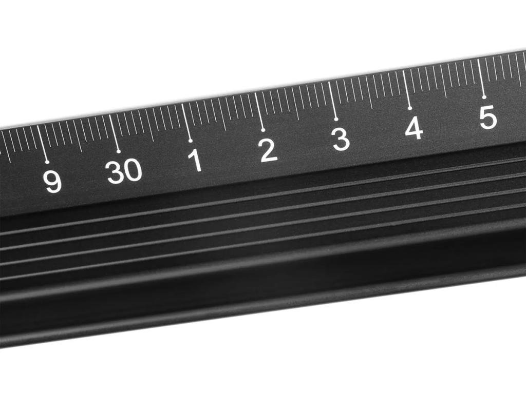 Vysokokvalitné rezacie pravítko z čierneho eloxovaného hliníka pre dlhú životnosť. Ľahko čitateľné centimetre pre maximálnu presnosť pri rezaní. 4 mm vysoká rezná hrana zaisťuje presné rezanie. Vysoký chránič proti prerezaniu (12,5 mm), ktorý účinne zabraňuje poraneniu prstov. Vyvýšený hrebeň zabraňuje rozmazaniu atramentu. Žiadne skĺznutie pri kreslení alebo strihaní vďaka 15 mm širokému protišmykovému pásiku na spodnej strane. Dĺžka 45 cm.Dodatočné parametre