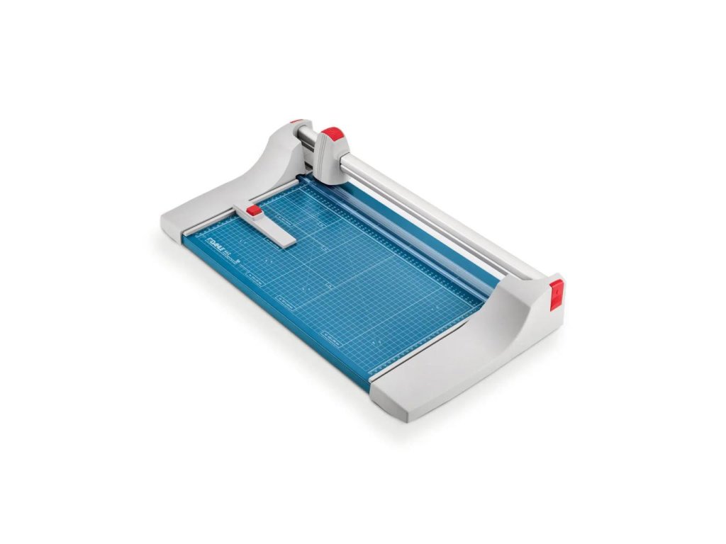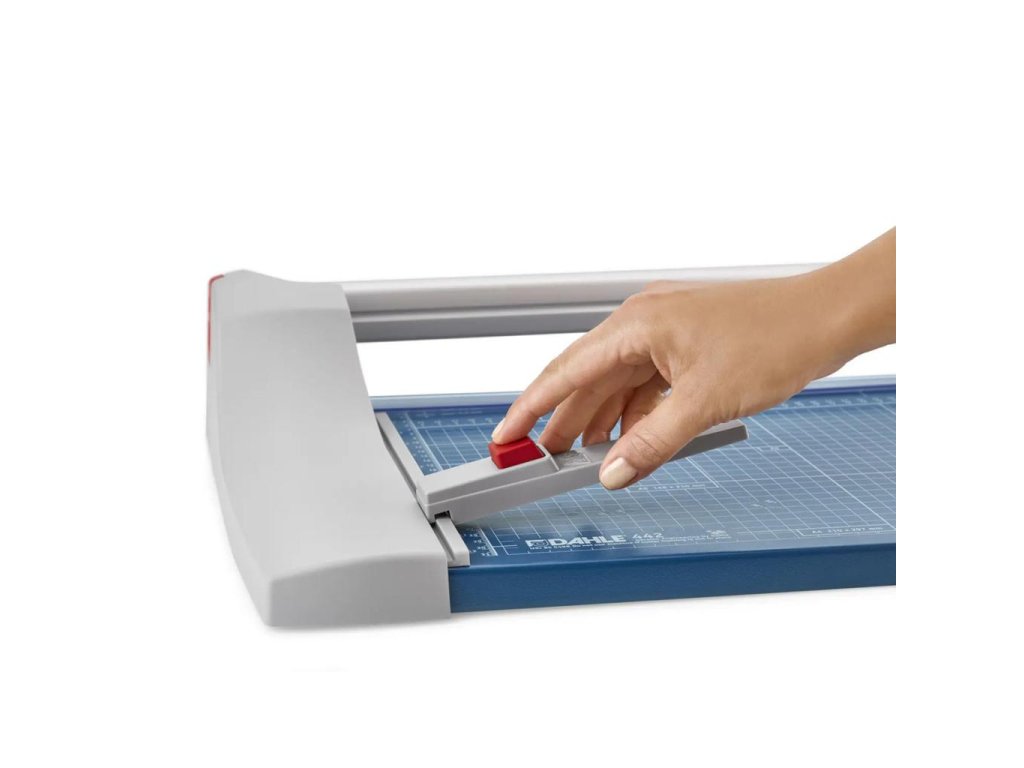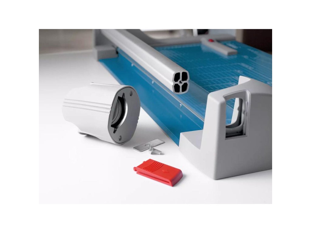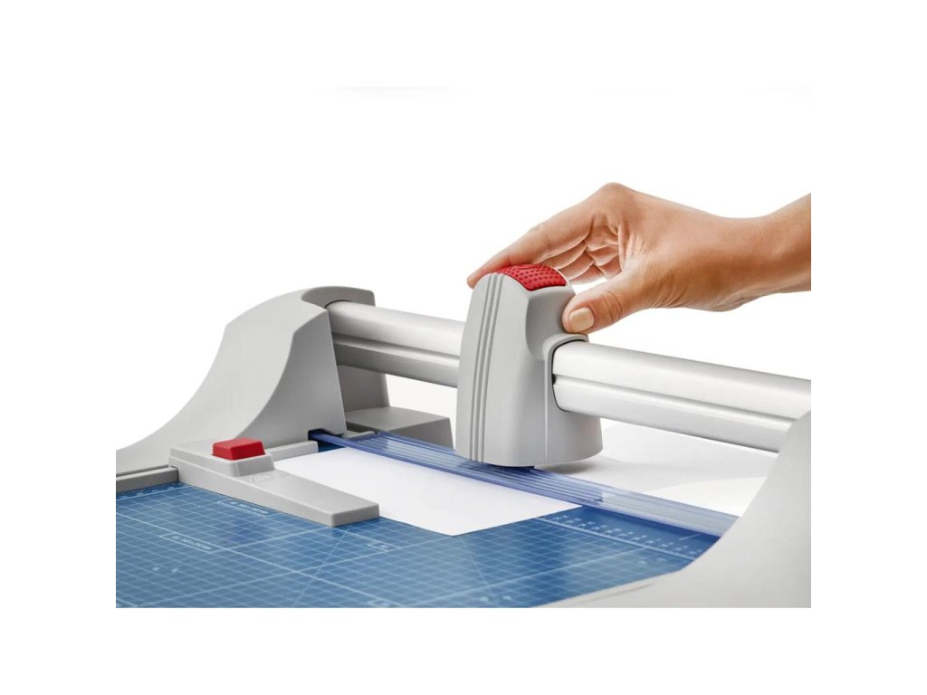 Profesionálna rezačka s kovovou základňou a presným rezom na grafické účely (filmy, fólie, papier). Kvalita na dosiahnutie najvyššej presnosti - automatický prítlak pohybom rezacej hlavy, nastaviteľný zadný doraz s použitím na oba boky, množstvo zakreslených orientačných DIN formátov. Kruhový nôž umiestnený v plastovom ochrannom kryte sa automaticky brúsi pri rezaní o protinôž (oba nože z tvrdenej ocele). Mierka v cm/inch. Možnosť montáže na stenu.Automatické upnutie na reznej čiare pre rýchle upevnenie rezaného materiálu.
