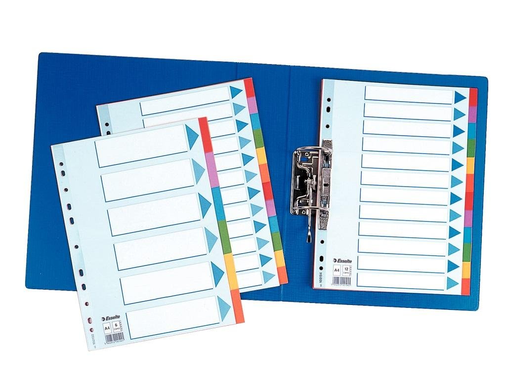 Celofarebný rozraďovač Esselte vyrobený z kartónu v rôznych farbách. Formát A4, eurodierovanie, popisovateľný titulný list na jasnú identifikáciu obsahu. Balenie jedna sada v polyesterovom sáčku. Väčšie balenie 10 sád.Formát: A4