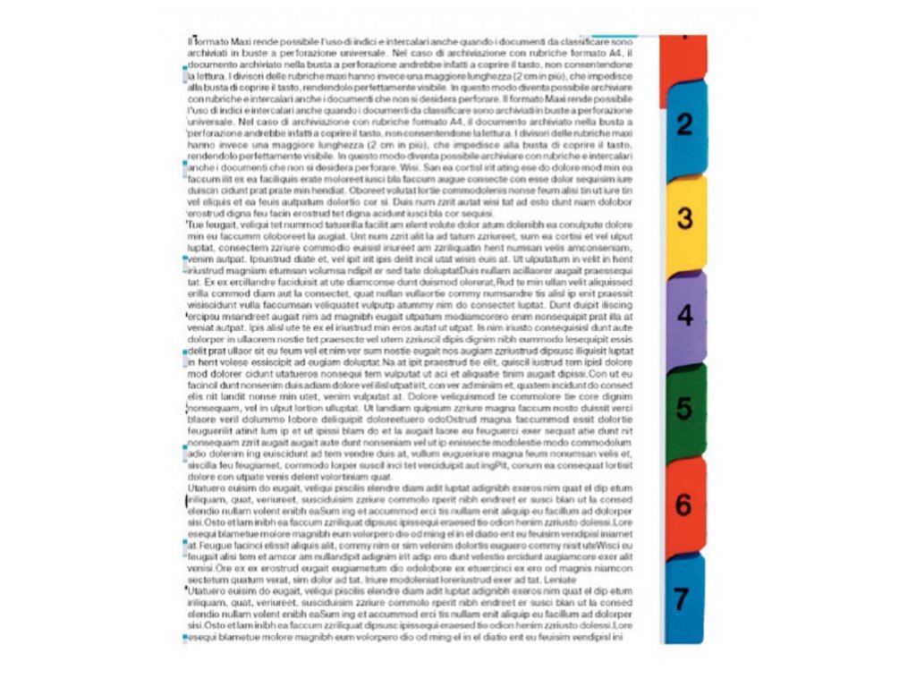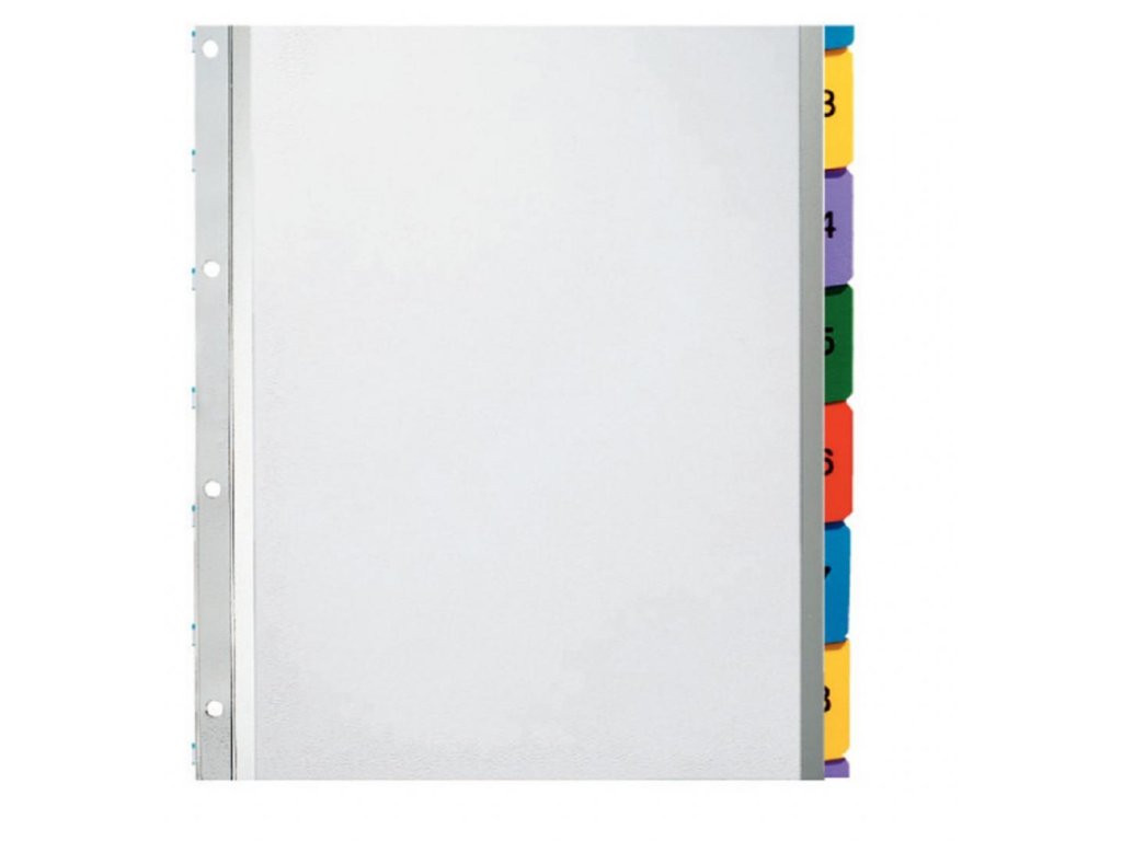 Rozraďovač vyrobený z kvalitného silného kartónu. Formát A4 maxi, vystužené eurodierovanie, farebné plastové rozlišovacie okraje, titulný list potiahnutý špeciálnou vrstvou, umožňujúcou zmenu popisu vygumovaním. Balenie jedna sada v polyesterovom sáčku. Väčšie balenie 10 sád.Formát: A4 maxi