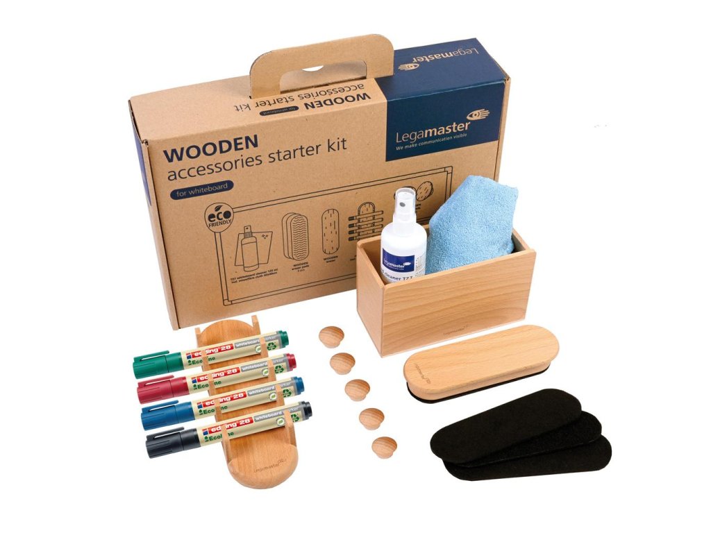 Štartovacia súprava obsahujúca 17 nástrojov na optimálne využitie všetkých tabúľ Legamaster a udržiava poriadok v kancelárii. Produkty obsahujú materiál z dobre spravovaných lesov s certifikátom FSC® a iných kontrolovaných zdrojov (FSC C158462) Obsah: 1x drevená stierka, 3x náhradné náplne do stierky, 1x drevený držiak na príslušenstvo, 1x drevený držiak popisovačov, 5x drevené magnety, 4x Eco‑ Line 28 - popisovačov na tabuľu (čierna, červená, modrá, zelená), 1x čistič tabúľ TZ7 125ml, 1x utierka z mikrovlákna 40x40cm. Dodávané, znovu naplniteľné popisovače sú klimaticky neutrálne, pretože sú vyrobené z 90 % recyklovateľných materiálov.Dodatočné parametre