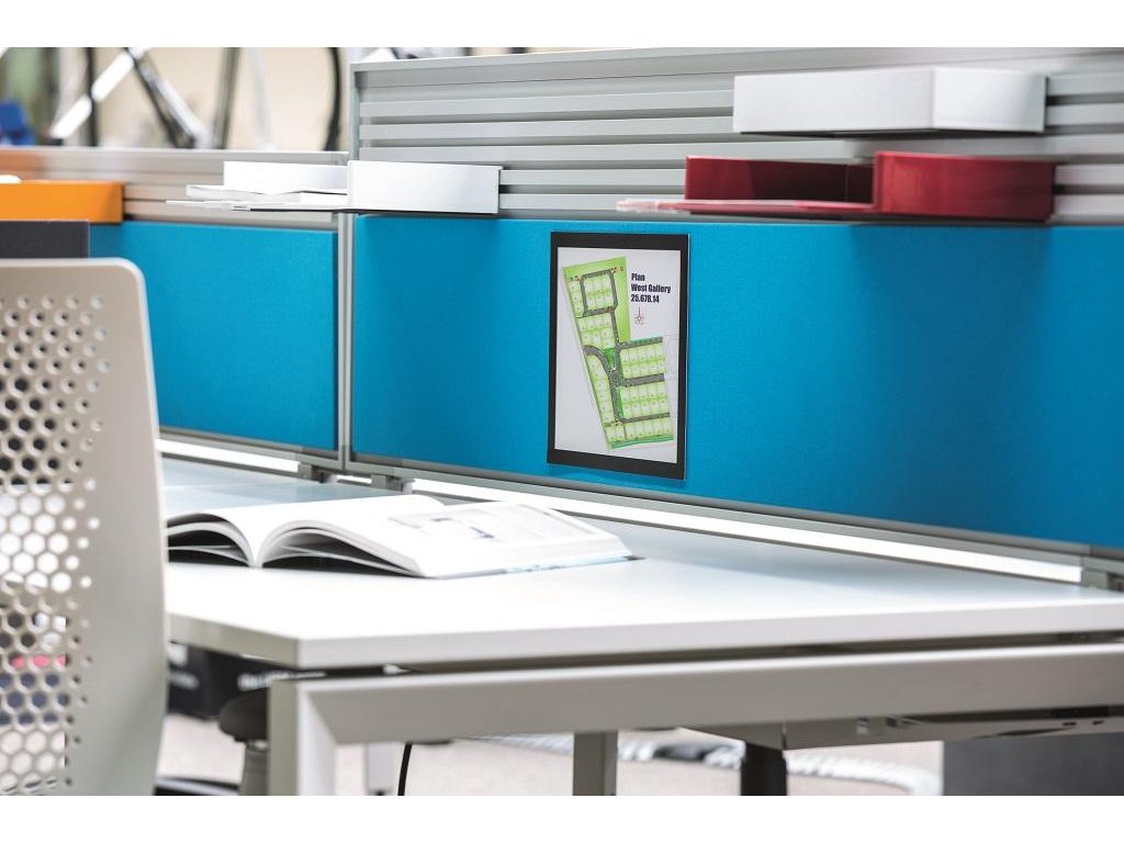 Informačný panel použiteľný iba na textilné povrchy, ako napr. textilné a moderačné tabule. Jednoduché a rýchle vkladanie informácie formátu A4. Na zadnej strane špeciálny priľnavý povrch, ktorý pri premiestňovaní panelu nepoškodzuje textilný povrch tabule. Farba čierna. Balenie 1 ks.Dodatočné parametre