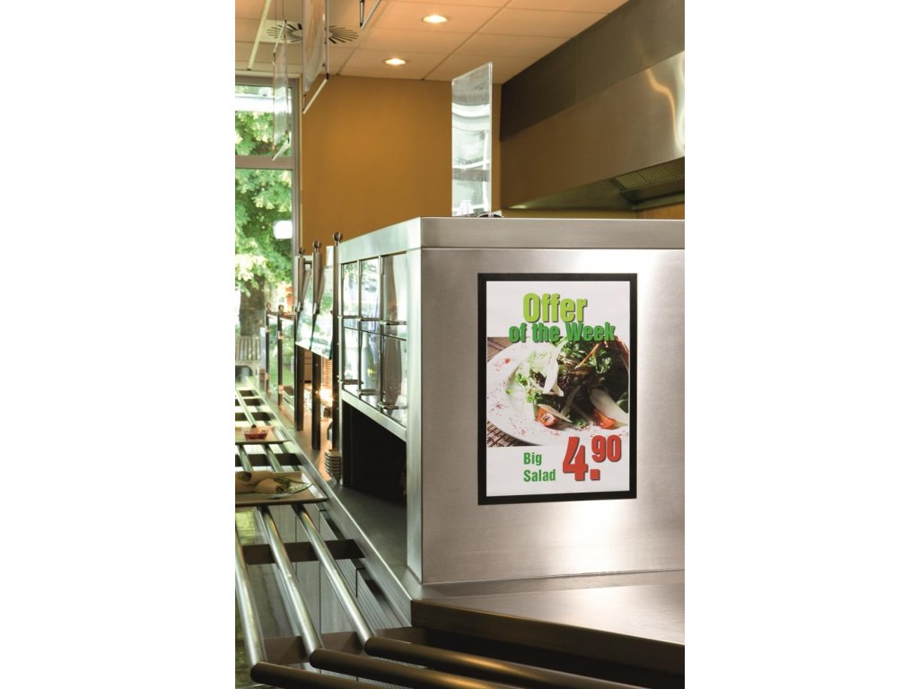 Samolepiaci informačný panel s prednou magnetickou časťou. Ideálny na vystavovanie plagátov, kľúčových informácií, špeciálnych oznamov alebo dôležitých čísel. Informácie sa ľahko vymieňajú a sú čitateľné z oboch strán, ak sa panel umiestni napr. na okno alebo priehľadné dvere. Vhodný na hladké a pevné povrchy. V prípade potreby je ľahko premiestniteľný bez potreby vŕtania. Formát A3, rámik čierny.Dodatočné parametre