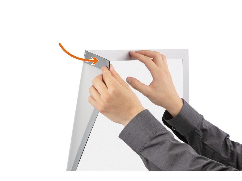 Informačný panel s prednou magnetickou časťou samolepiaci na 2 kratších stranách. „Bezbublinkové“ prevedenie vďaka lepeniu na 2 zo 4 strán. Ideálny na vystavovanie oznamov. Informácie sa ľahko vymieňajú a sú čitateľné z oboch strán. Vhodný na hladké a pevné povrchy. S ochranou voči UV žiareniu. Odoláva teplotám až do 70 °C. Formát A1. Farba strieborná.Technické parametre: