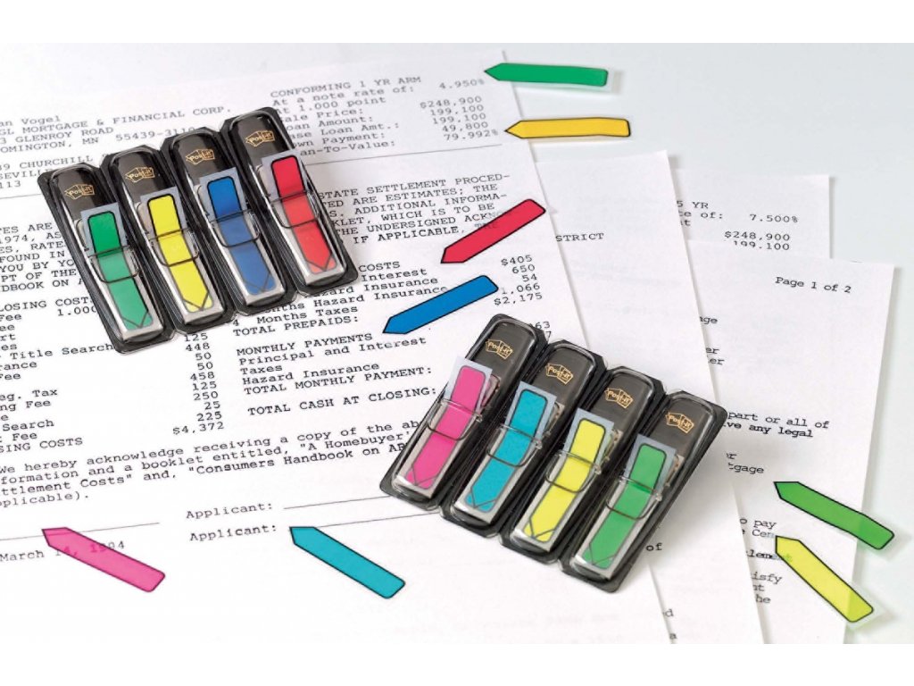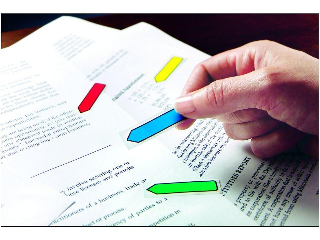 Úzke acetátové záložky do kníh, časopisov, ako register do cenníkov, kartoték, katalógov, zakladačov, archívov a pod. Priehľadná lepiaca čast a farebná časť na označenie.Prelepiteľné, znovunalepiteľné a popisovateľné. Rozmery záložky 12,5x43 mm.Dodávané v kombinácii 4 základných (červená,zelená, modrá, žltá) alebo 4 neónových farieb (žltá, fialová, ružová, modrá) po 24 lístkov.Záložky s potlačou šípky upozorňujú na konkrétnu informáciu v texte. Šírka indexu 12,5 mm, v balení 4 farby po 24 lístkov.- Post-it® záložky umožňujú jednoducho označiť alebo zvýrazniť dôležité informácie. Bezpečne držia.