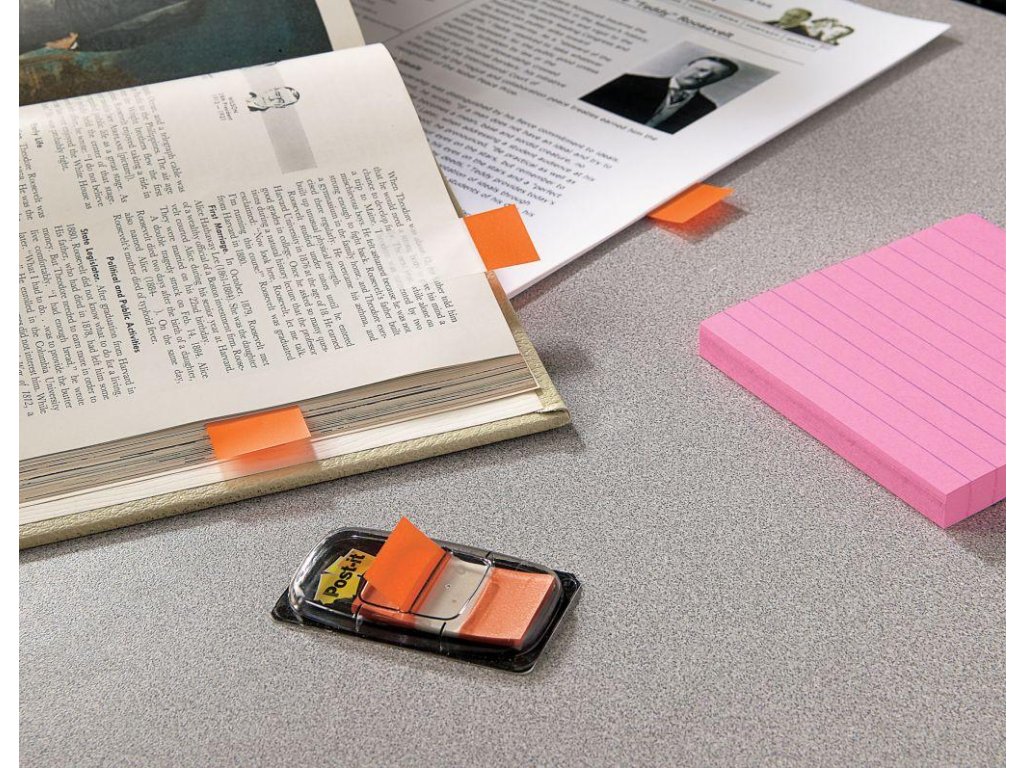 Široké acetátové záložky do kníh, časopisov, ako register do cenníkov, katalógov, kartoték, zakladačov, archívov a pod. Priehľadná lepiaca časť a farebná časť na označenie. Prelepiteľné, znovunalepiteľné a popisovateľné. Rozmery záložky 25,4×43,2 mm. Balenie 2×50 lístkov. Farba oranžová..- Post-it® záložky umožňujú jednoducho označiť alebo zvýrazniť dôležité informácie. Bezpečne držia. Možno ich odstrániť bez stôp.