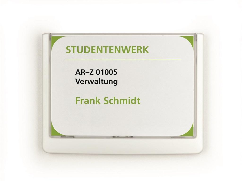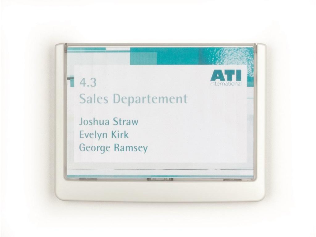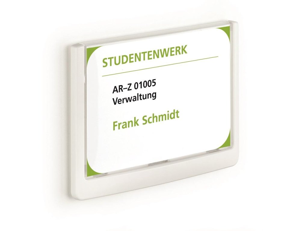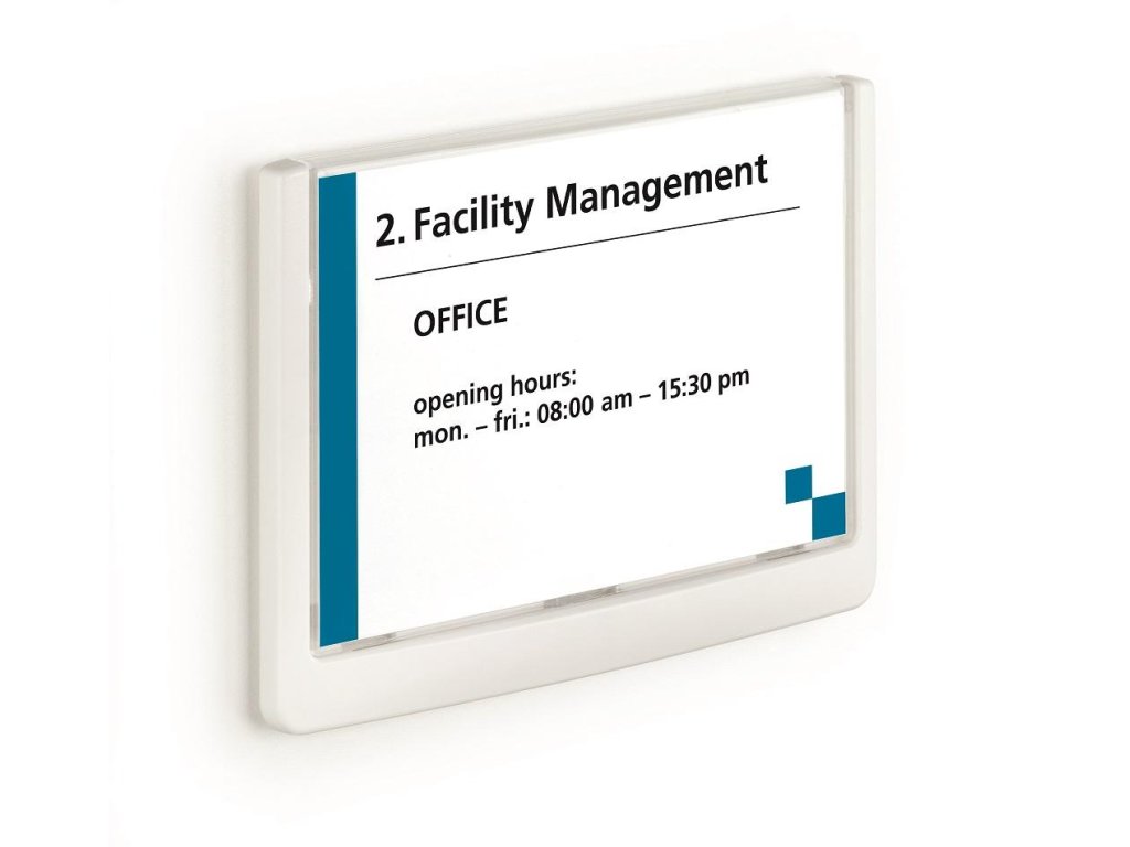 Moderná informačná tabuľka na dvere s lemom v atraktívnej bielej farbe. Predný panel sa otvára na jedno zatlačenie, a tým sa jednoducho sprístupnia vložené popisné papiere, ktoré sa môžu vymieňať podľa potrieb. Tabuľka je ideálna do kancelárií, úradov, škôl, univerzít a hotelov. Súčasťou balenia je montážna sada s názorným návodom. Namiesto pevného montovania môže byť tabuľka k povrchu aj prilepená.Rozmery: 149 x 105,5 mm