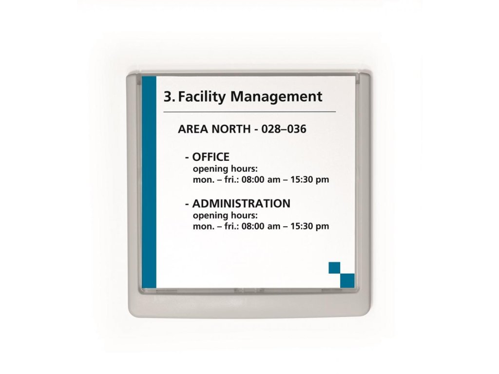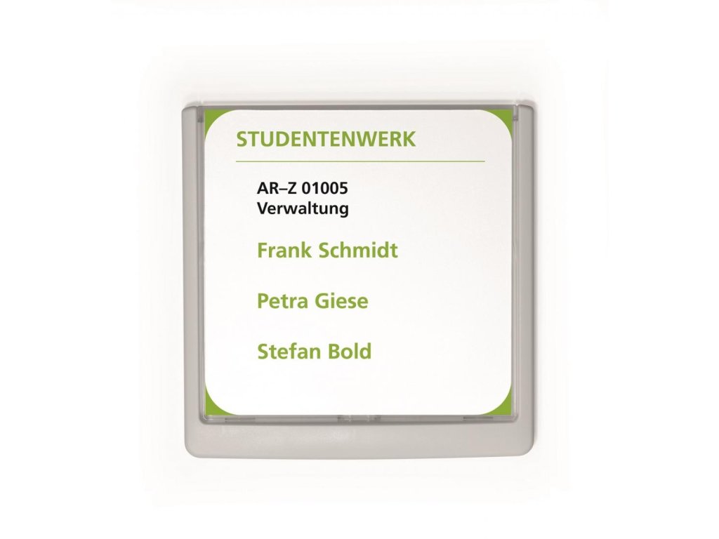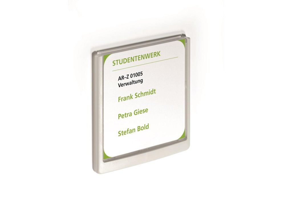 Moderná informačná tabuľka na dvere s lemom v atraktívnej bielej farbe. Predný panel sa otvára na jedno zatlačenie, a tým sa jednoducho sprístupnia vložené popisné papiere, ktoré sa môžu vymieňať podľa potrieb. Tabuľka je ideálna do kancelárií, úradov, škôl, univerzít a hotelov. Súčasťou balenia je montážna sada s názorným návodom. Namiesto pevného montovania môže byť tabuľka k povrchu aj prilepená.Rozmery: 149 x 148,5 mm